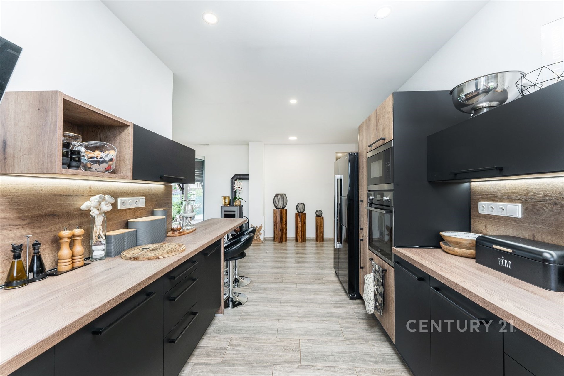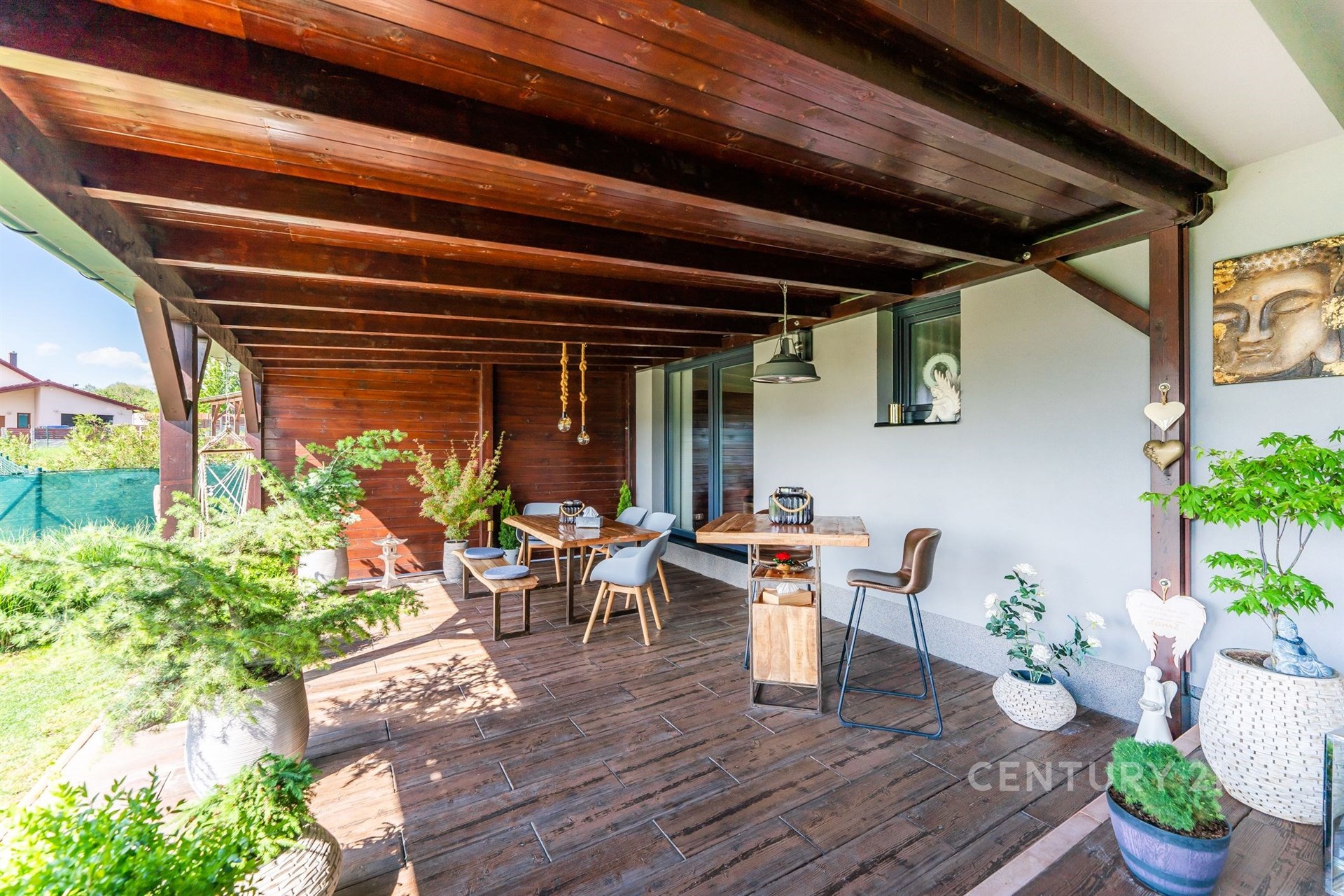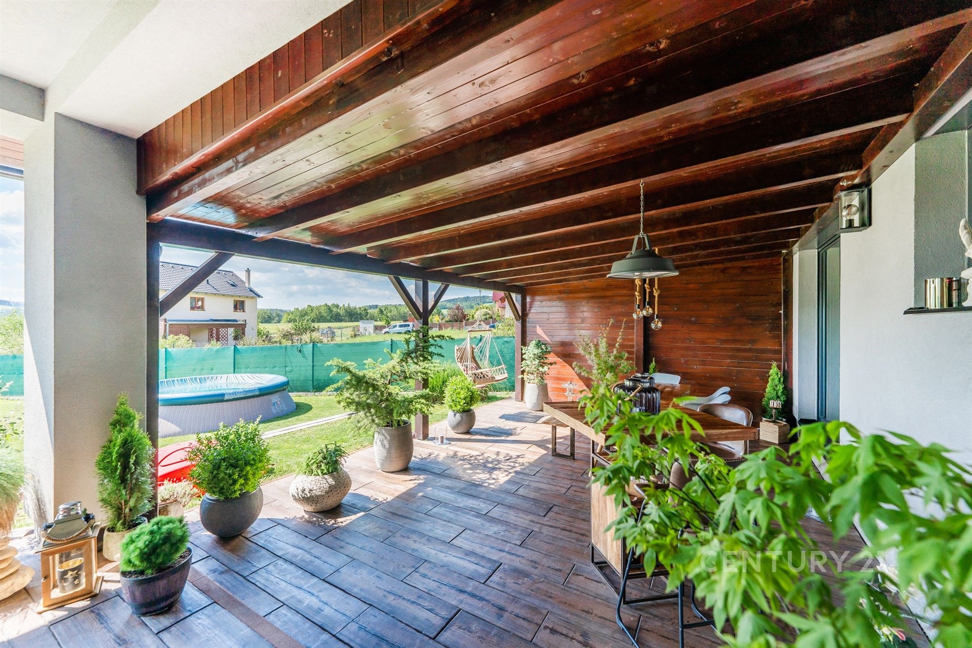 Prostorný dům disponuje třemi útulnými pokoji. Designová kuchyň s vestavěnými spotřebiči je spojena se vzdušným obývacím pokojem. Na ten navazuje velkorysá krytá terasa (47 m2) poskytující dokonalé zázemí pro trávení společného času s rodinou, přáteli či o samotě při relaxu s výhledem do půvabné krajiny. Dům je plně vybaven vkusným nábytkem, což usnadní novým majitelům přechod do nového domova.