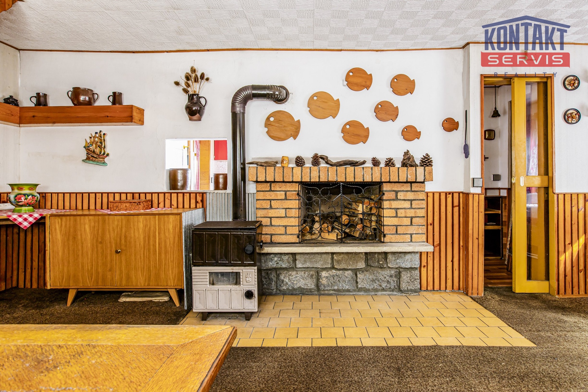 * Prostorný obývací pokoj s krbem – srdce celé chaty! Večery u praskajícího ohně, teplá atmosféra, pohoda a relax. Tady se budou psát ta nejkrásnější vzpomínky vaší rodiny