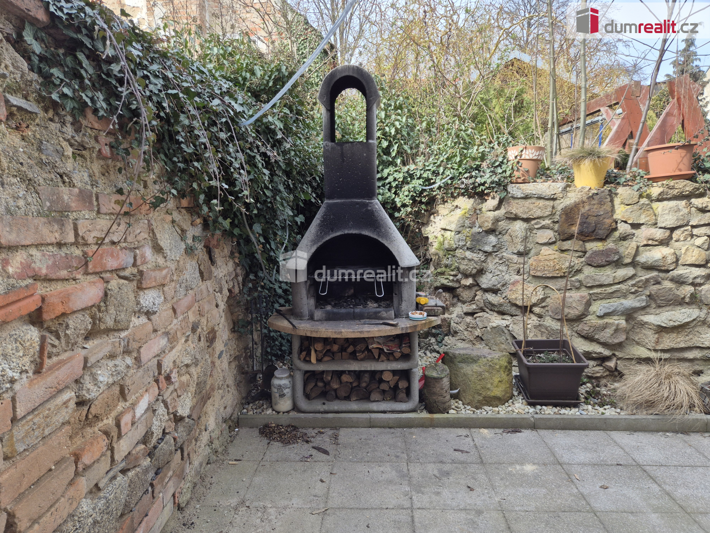 Příjemně lze posedět na oplocené předzahrádce na východní straně směrem k návsi a pak i za domem "na dvorku" s krbem, kde je přístup také do sklepa.