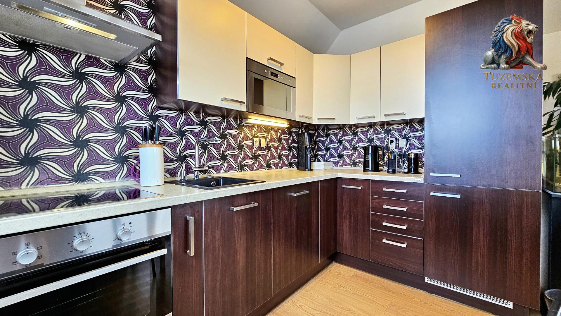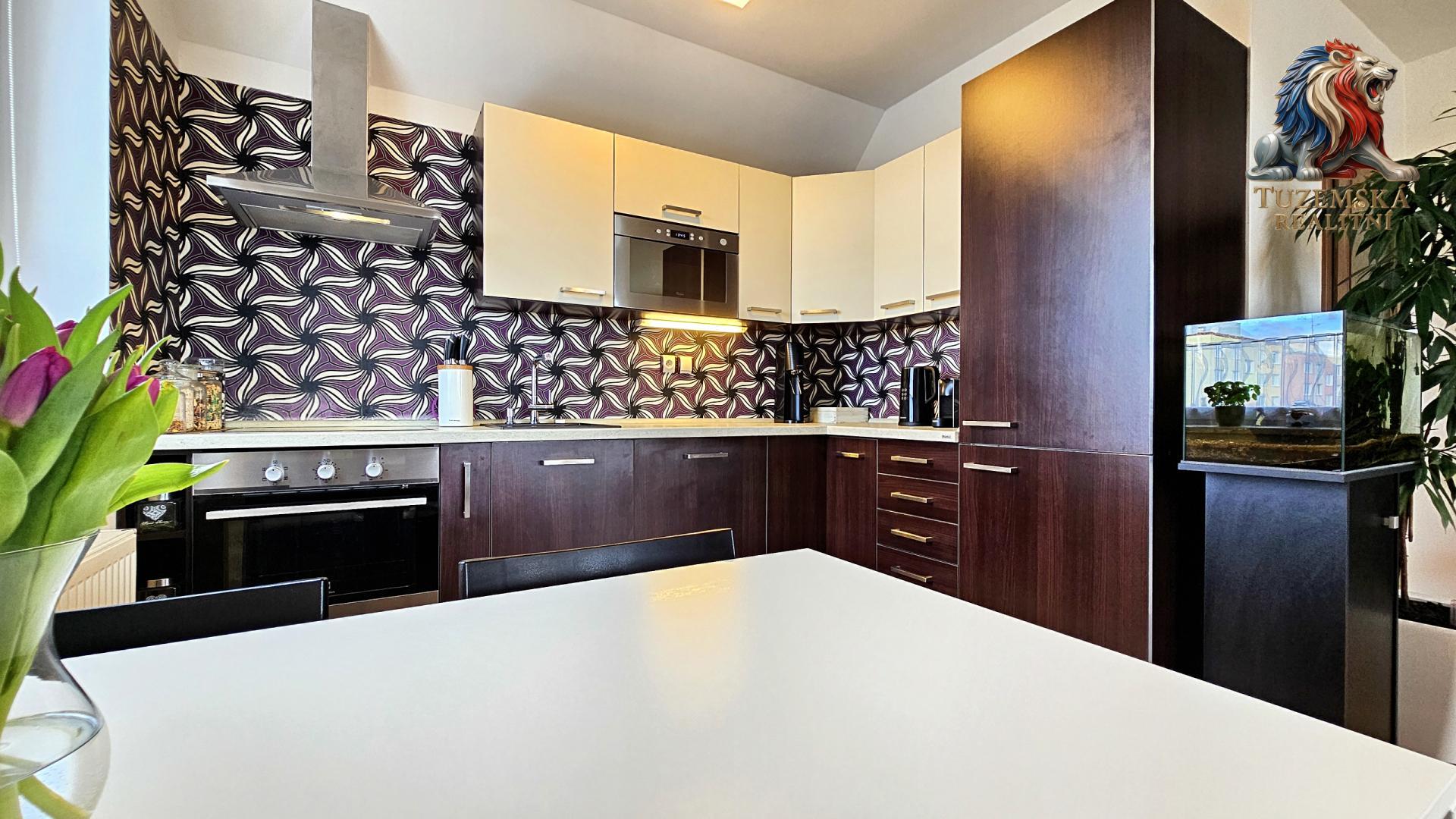 Kuchyňská linka je vybavena kvalitními vestavěnými spotřebiči značky Electrolux, a to sklokeramická varná deska, elektrická trouba, digestoř, myčka nádobí, lednice s mrazákem a dále mikrovlnou troubou Whirpool.
