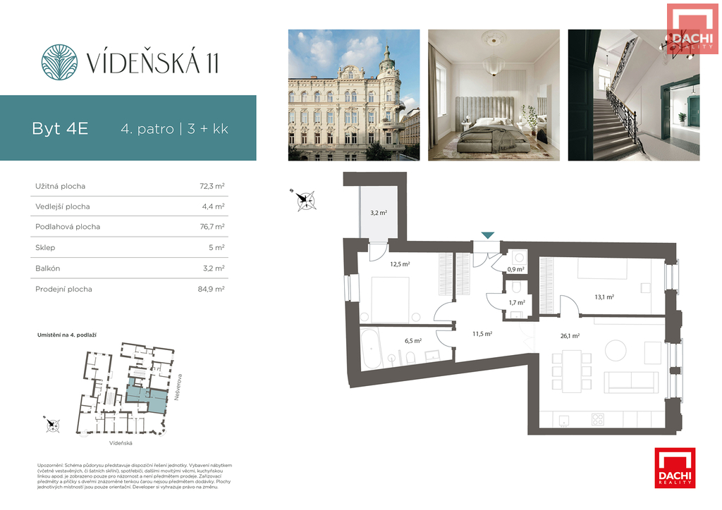 Nadstandardní cihlový byt 3+kk – 4. podlaží, 72,6 m² + balkon a sklep | Vídeňská, Olomouc