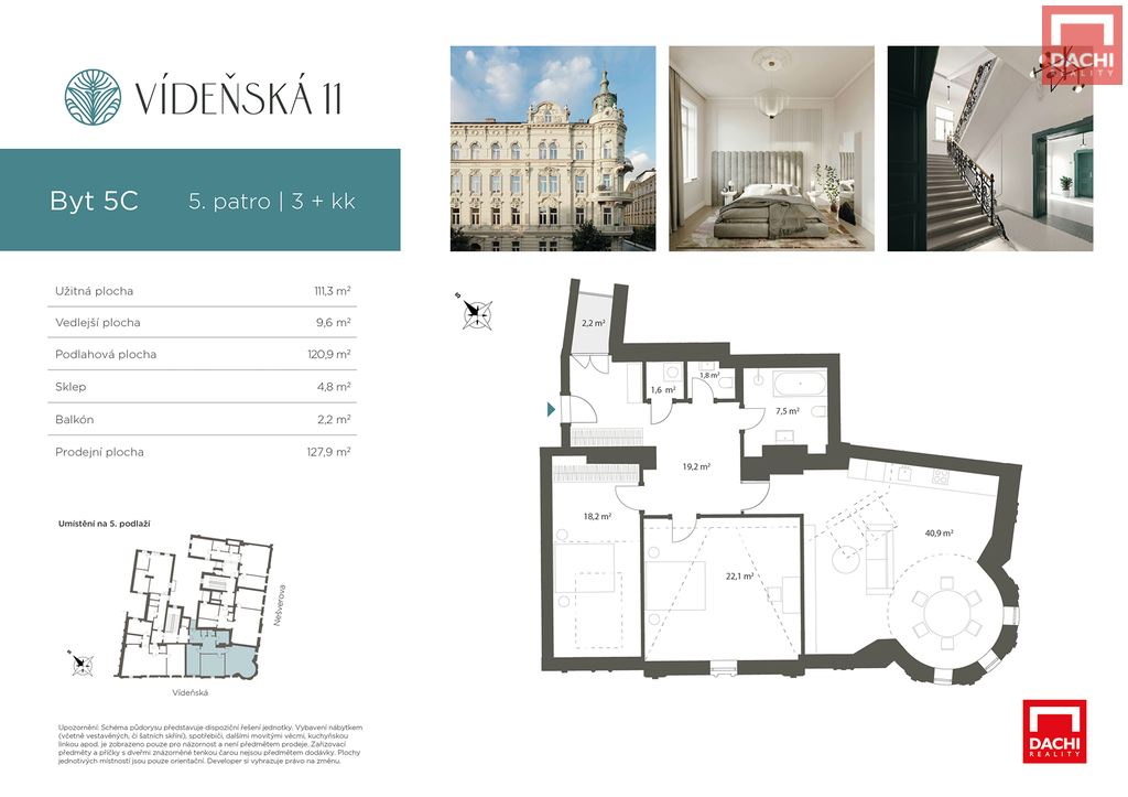 Nabízíme Vám jako výhradní prodejce naprosto výjimečný penthouse 3+kk v nejvyšším podlaží rezidence Vídeňská 11. Tento podkrovní byt o podlahové ploše 120,9 m² se nachází v 5. podlaží historické budovy z roku 1899. Jeho naprostou raritou je architektonicky výrazná věžička, která tvoří výjimečný a inspirativní prvek interiéru. Nabízí se zde možnost vybudovat druhé patro, které může sloužit jako relaxační kout, domácí knihovna nebo klidová zóna – jde o prostor s velkým potenciálem a charakterem, jaký se opravdu jen tak nevidí.