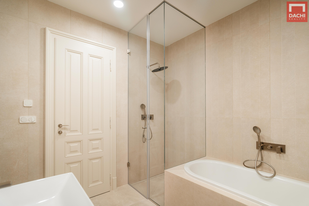 Součástí bytu je exkluzivní vybavení včetně koupelen Gessi, osvětlení Modular, podlah Foglie D’Oro od českých mistrů Valen&Masar a prémiové keramiky značky Porcelanosa.