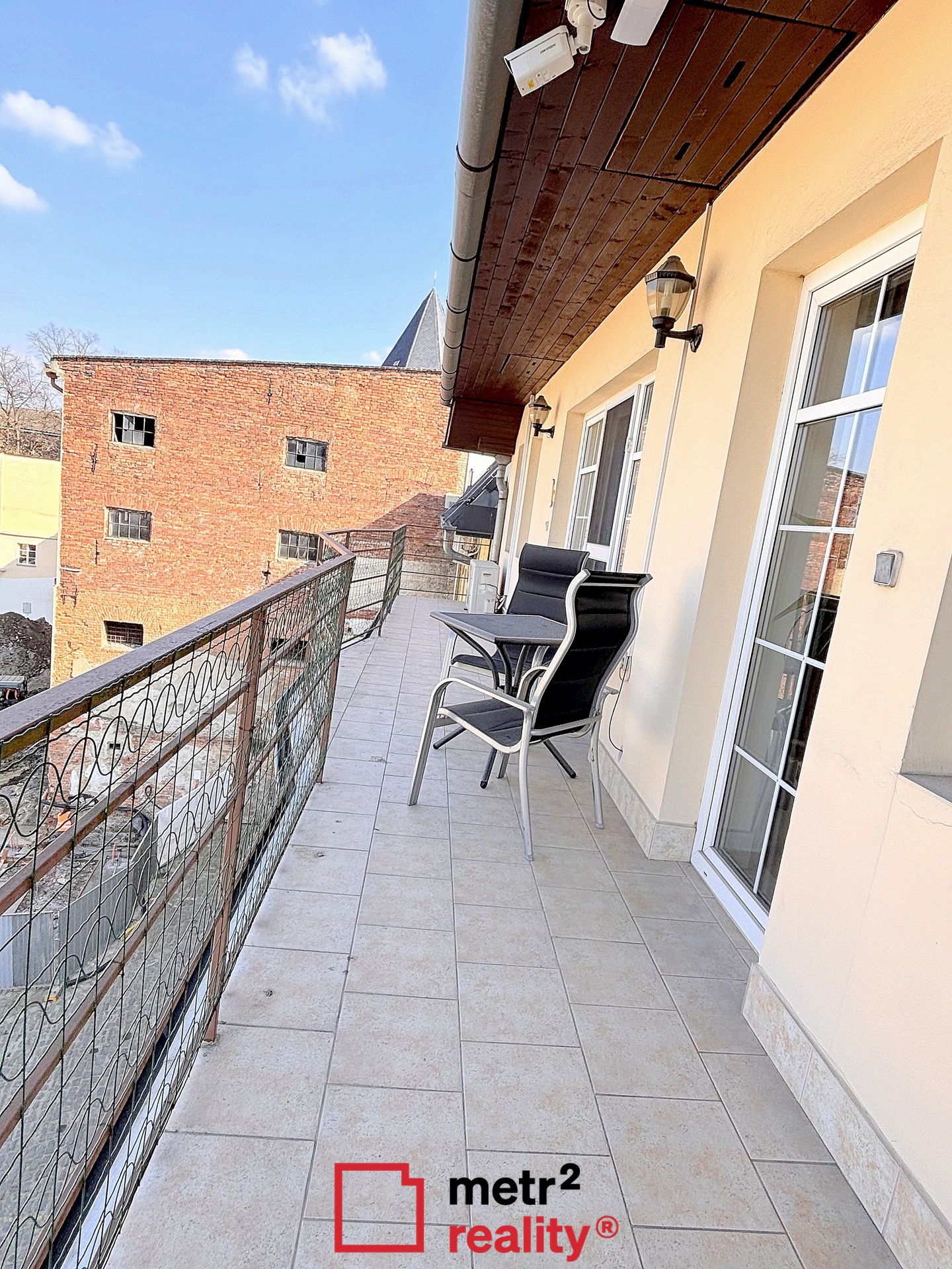 Ve výhradním zastoupení majitele vám nabízíme ke koupi unikátní cihlový byt o dispozici 2+kk (87,7 m²). Tato moderní půdní vestavba s terasou v historickém domě na ulici Sokolská v sobě spojuje kouzlo starého města s nadstandardním prostorem, který u této dispozice běžně nenajdete. Byt se nachází ve 4. nadzemním podlaží a díky svému umístění v podkroví je oázou klidu nad střechami města. Vzdušný a světlý pokoj propojený s kuchyní a jídelním koutem. Z obývací části vstoupíte na průběžnou terasu, na kterou je vstup i z vedlejšího pokoje, který slouží jako ložnice. V ložnici je také velká vestavěná skříň. Koupelna je vybavena vanou i sprchovým koutem a toaletou. V bytě najdete také druhou samostatnou toaletu a praktickou technickou místnost vhodnou pro pračku a sušičkou. Vstupní chodba je vybavena dalšími prostornými vestavěnými skříněmi. Vytápění zajišťuje plynový kotel, ohřev vody elektrický bojler. Dům, ve kterém se byt nachází je kvalitní cihlová stavba s bohatou historií, prošel v roce 2000 kompletní rekonstrukcí a je ve velmi dobrém technickém stavu.