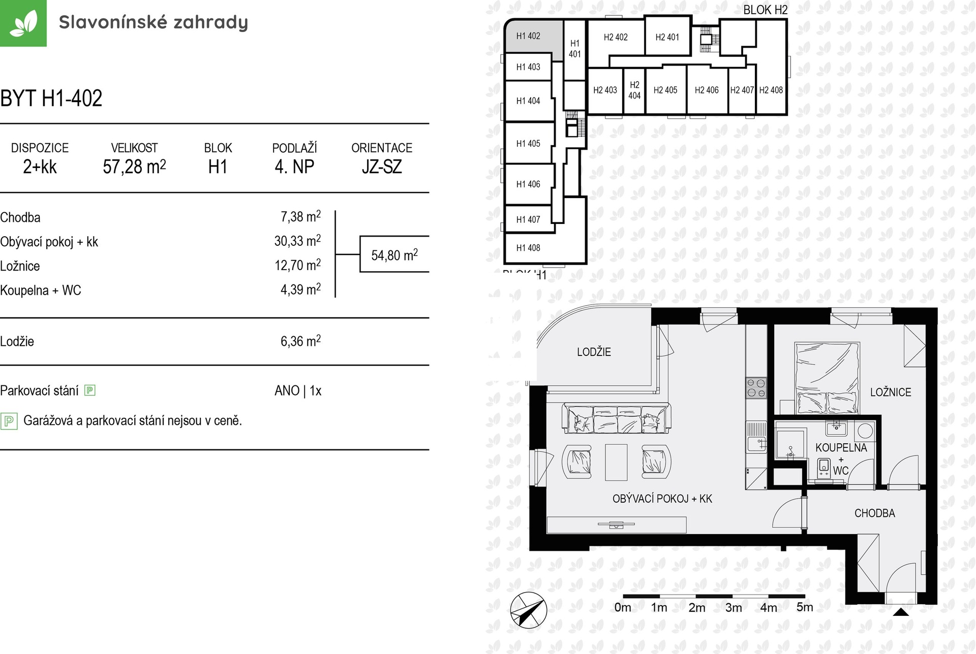 Byt s podlahovou plochou 57,28 m2 + balkon 6,36 m2 nabízí naprostý klid,