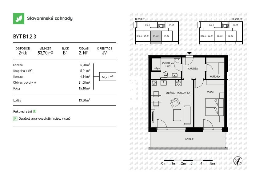 Byt B1.2.3 o dispozici 2+kk má podlahovou plochu 53,7 m² a terasa o velikosti 13,86 m² se nachází ve 2.NP bytového domu s nízkým počtem bytových jednotek.