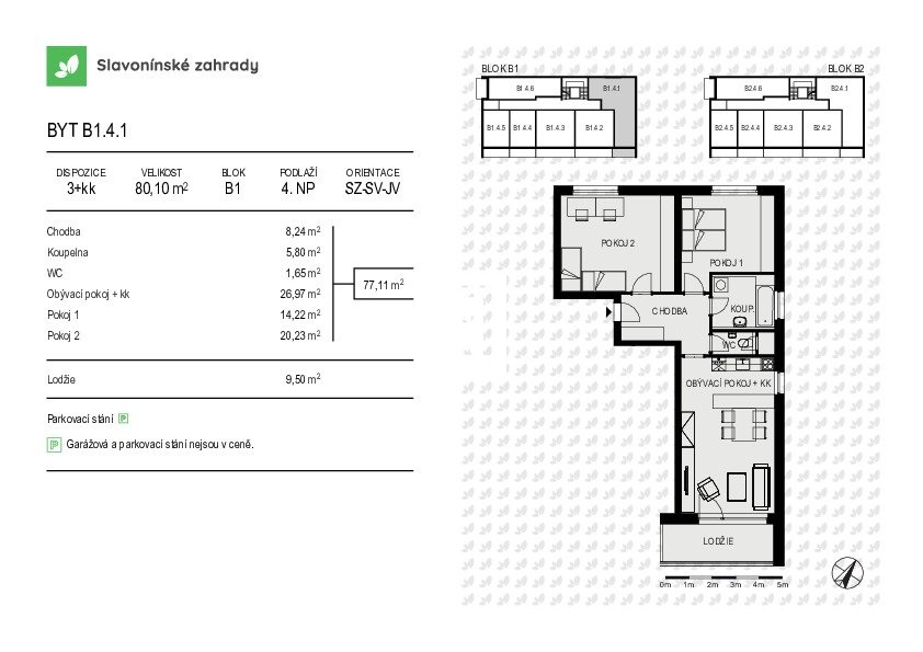 Byt B1.4.1 o dispozici 3+kk má podlahovou plochu 80,1 m², terasa o velikosti 9,5 m² a nachází se ve 4.NP bytového domu s nízkým počtem bytových jednotek.
