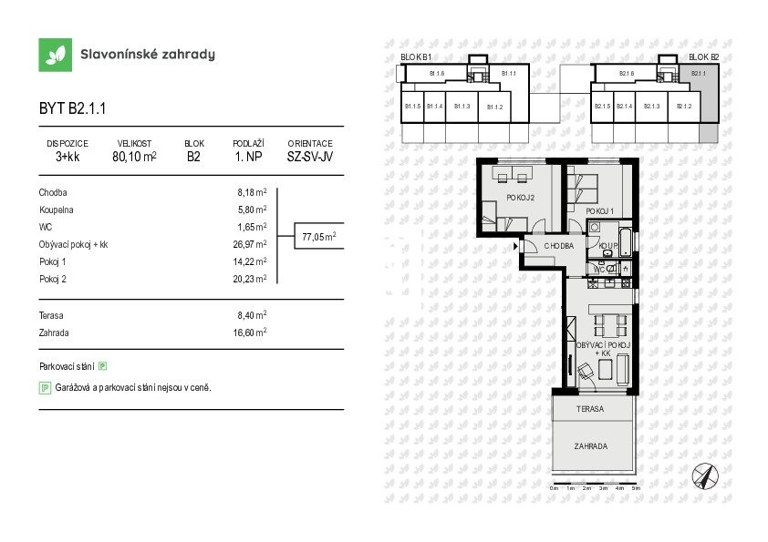 Byt B2.1.1 o dispozici 3+kk má podlahovou plochu 80,1 m², terasa o velikosti 8,4 m² a zahrada o velikosti 16,6 m2 se nachází v 1.NP bytového domu s nízkým počtem bytových jednotek.