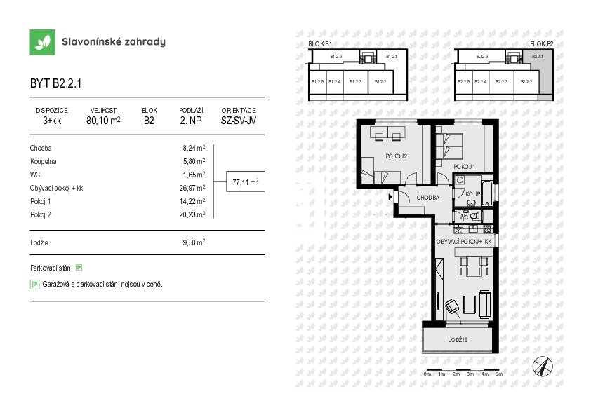 Byt B2.2.1 o dispozici 3+kk má podlahovou plochu 80,1 m², terasa o velikosti 9,5 m² a nachází se ve 2.NP bytového domu s nízkým počtem bytových jednotek.
