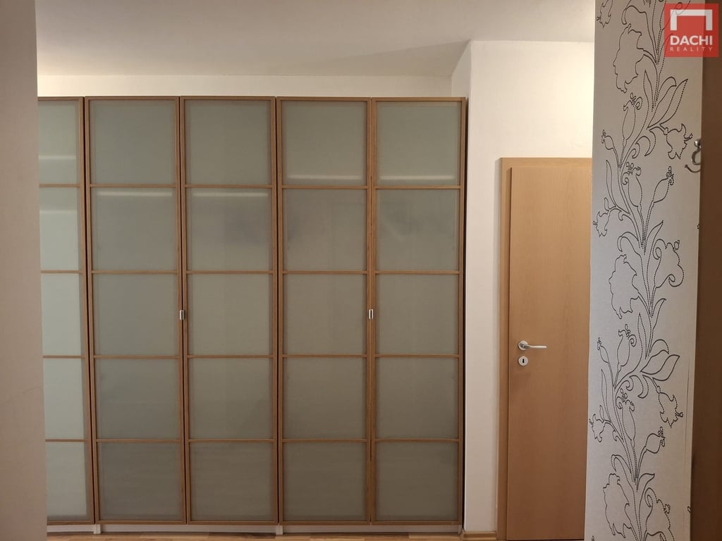 Byt je vybavený kuchyňskou linkou s vestavnými spotřebiči (trouba, varná deska, myčka, lednice). V předsíni se nachází vestavná šatní skříň poskytující dostatek úložného prostoru. Jinak se pronajímá nezařízený.