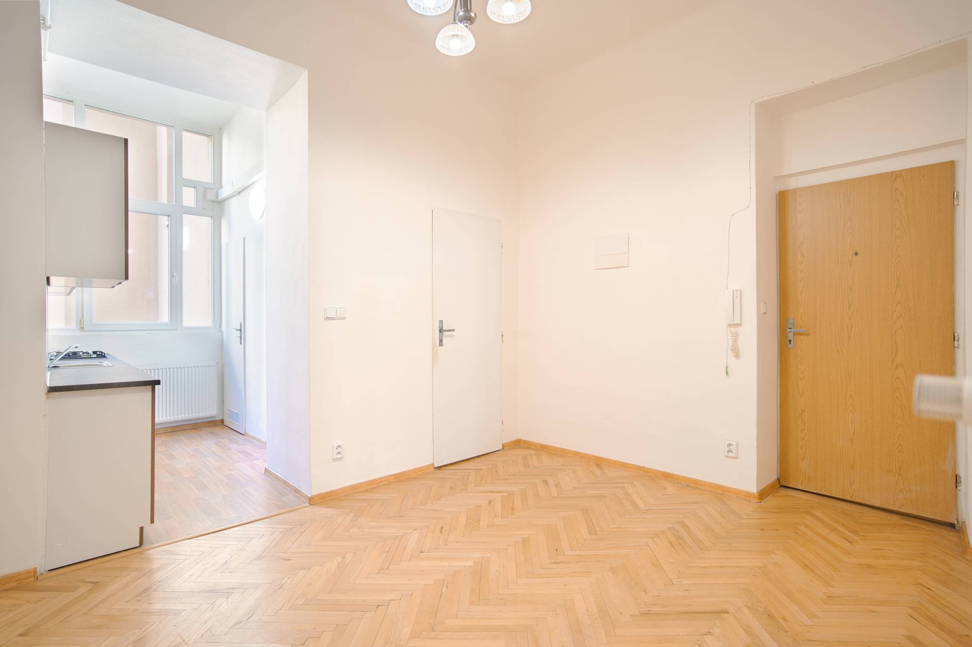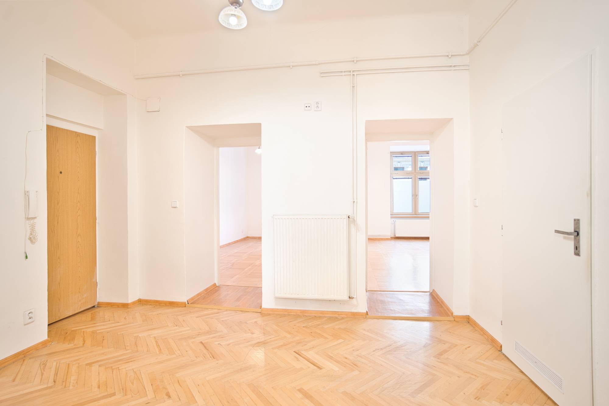 Tento prostor nabízí otevřenou vstupní část propojenou s kuchyní, jejíž součástí je také samostatná spíž. Tři samostatné pokoje mají vlastní přístup z předsíně. Dva z nich jsou orientovány do ulice a jsou mezi sebou propojeny dveřmi, třetí pokoj směřuje do klidného vnitrobloku. Součástí tohoto prostoru je také koupelna a samostatná toaleta.
