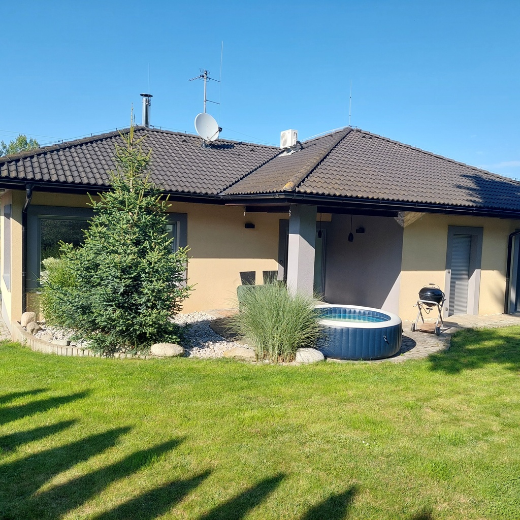 Vnitřní dispozice domu: zádveří (předsíň), samostatné wc s umyvadlem, obývací pokoj s krbem a východem na prostornou terasu, velmi pěkná kuchyň, kumbál, chodba s vestavěnou skříní, prostorná koupelna s vanou, sprchovým koutem, bidetem i televizí, dále je zde technická místnost a tři pokoje.