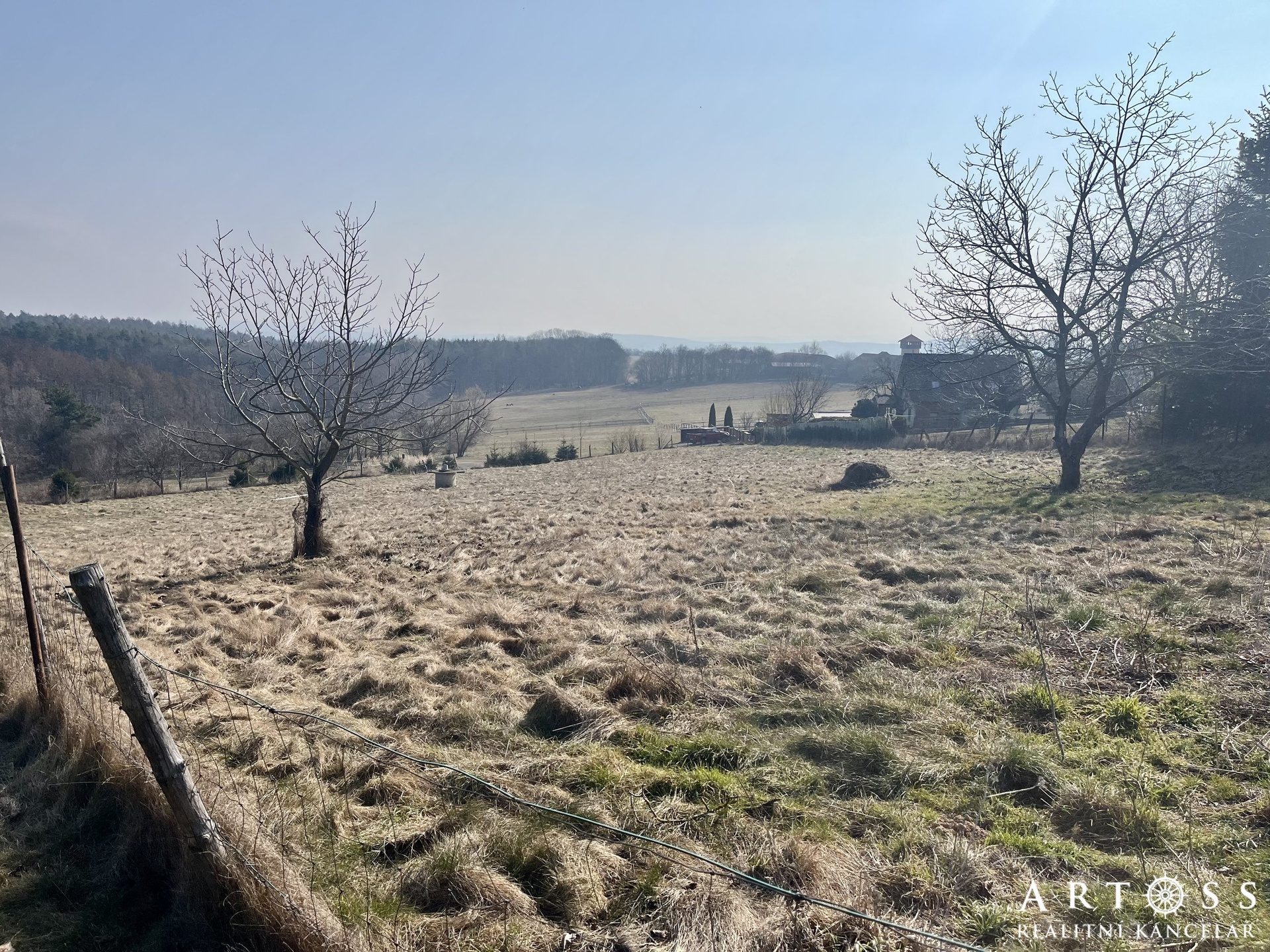 Pozemek se nachází na vyvýšeném místě, které zaručuje panoramatický výhled na okolní krajinu a lesy.