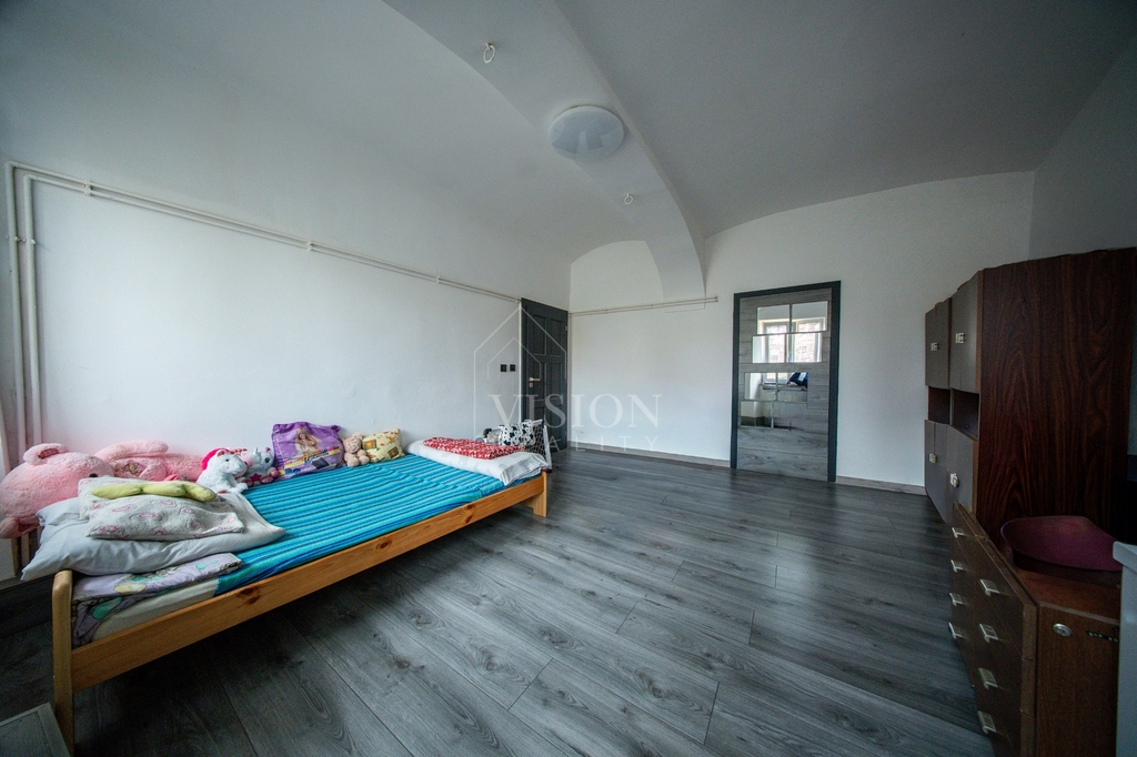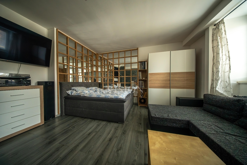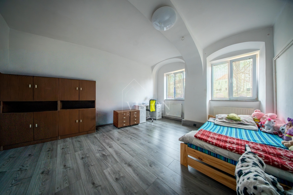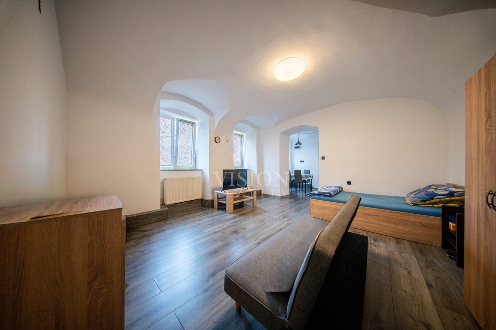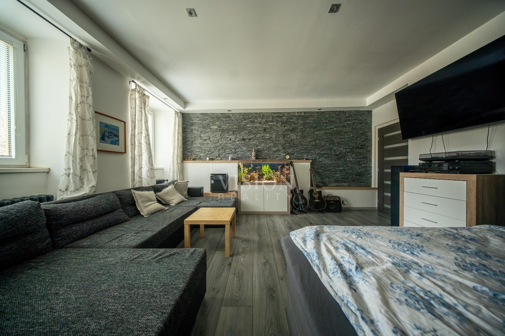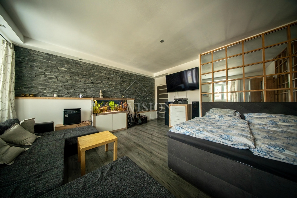 Součástí domu je také byt 1+1 o ploše 40 m², který nabízí pokoj, kuchyň a koupelnu s WC – ideální například pro dlouhodobý pronájem.