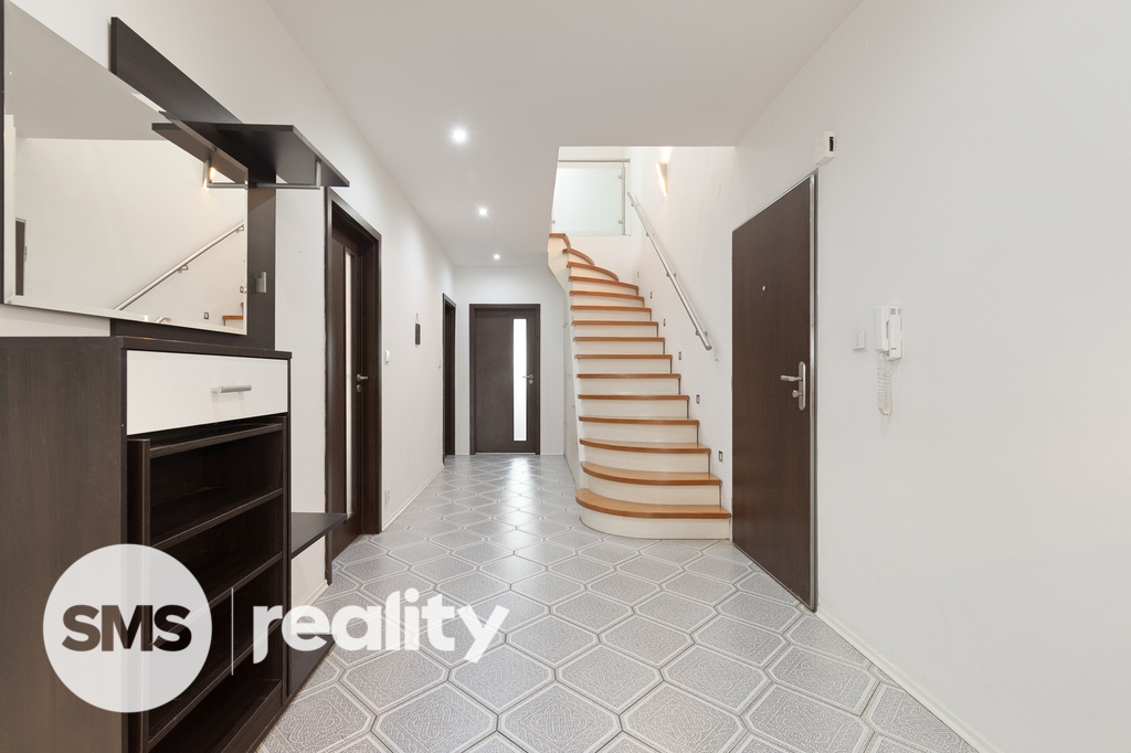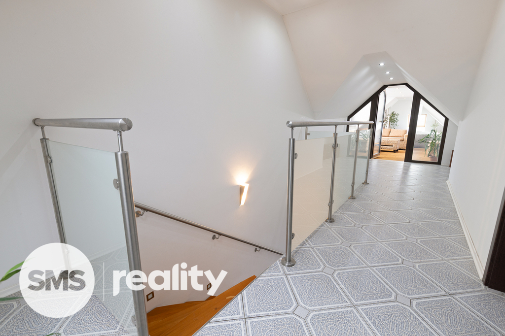 Z otevřené předsíně vede schodiště do horního patra o velikosti 59 m². Zde se nachází další pokoj a především velká zimní zahrada o 25 m² s vířivkou. Tato část bytu vytváří naprostou klidovou zónu – ideální místo pro relax, domácí wellness nebo odpočinek po práci.