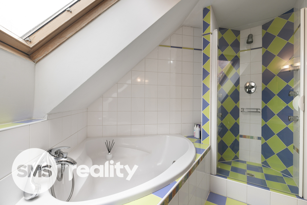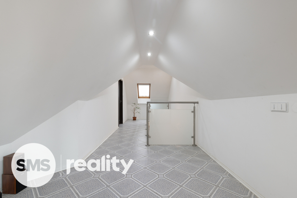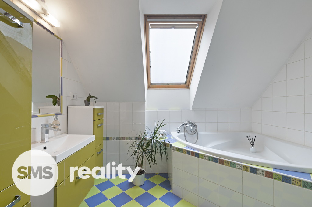 Na tomto podlaží se dále nachází koupelna se sprchovým koutem i rohovou vanou a samostatné WC. Celý prostor je díky množství střešních oken krásně prosvětlený a působí velmi vzdušně.
