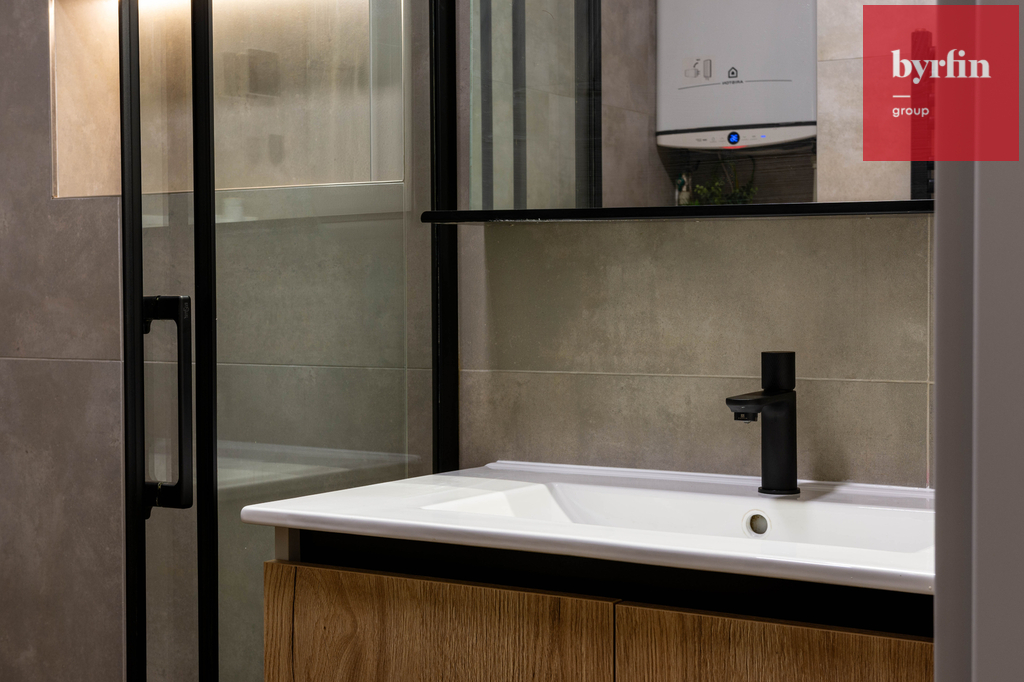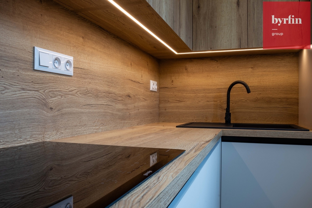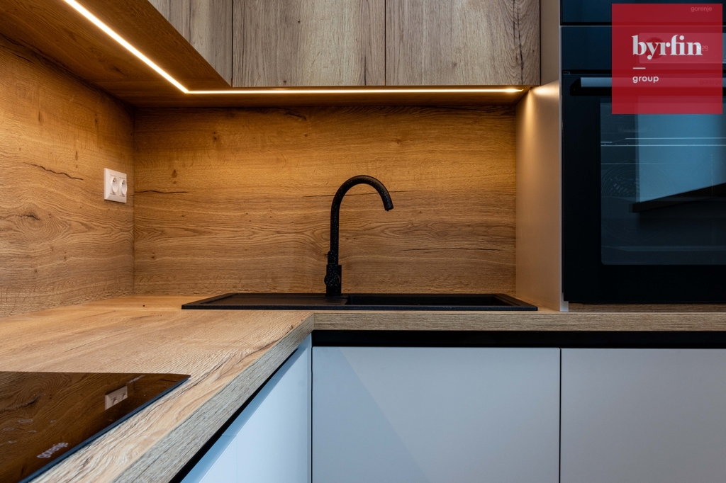 Na podlaze je kvalitní vinyl v dekoru dřeva, který ladí s kuchyňskou linkou. Interiér doplňují elegantní interiérové dveře v matné šedé barvě. Kuchyňská linka v dekoru dubu Halifax a kašmírově šedé barvě působí nadčasově a prémiově. Je plně vybavena spotřebiči značky Gorenje včetně myčky a lednice.