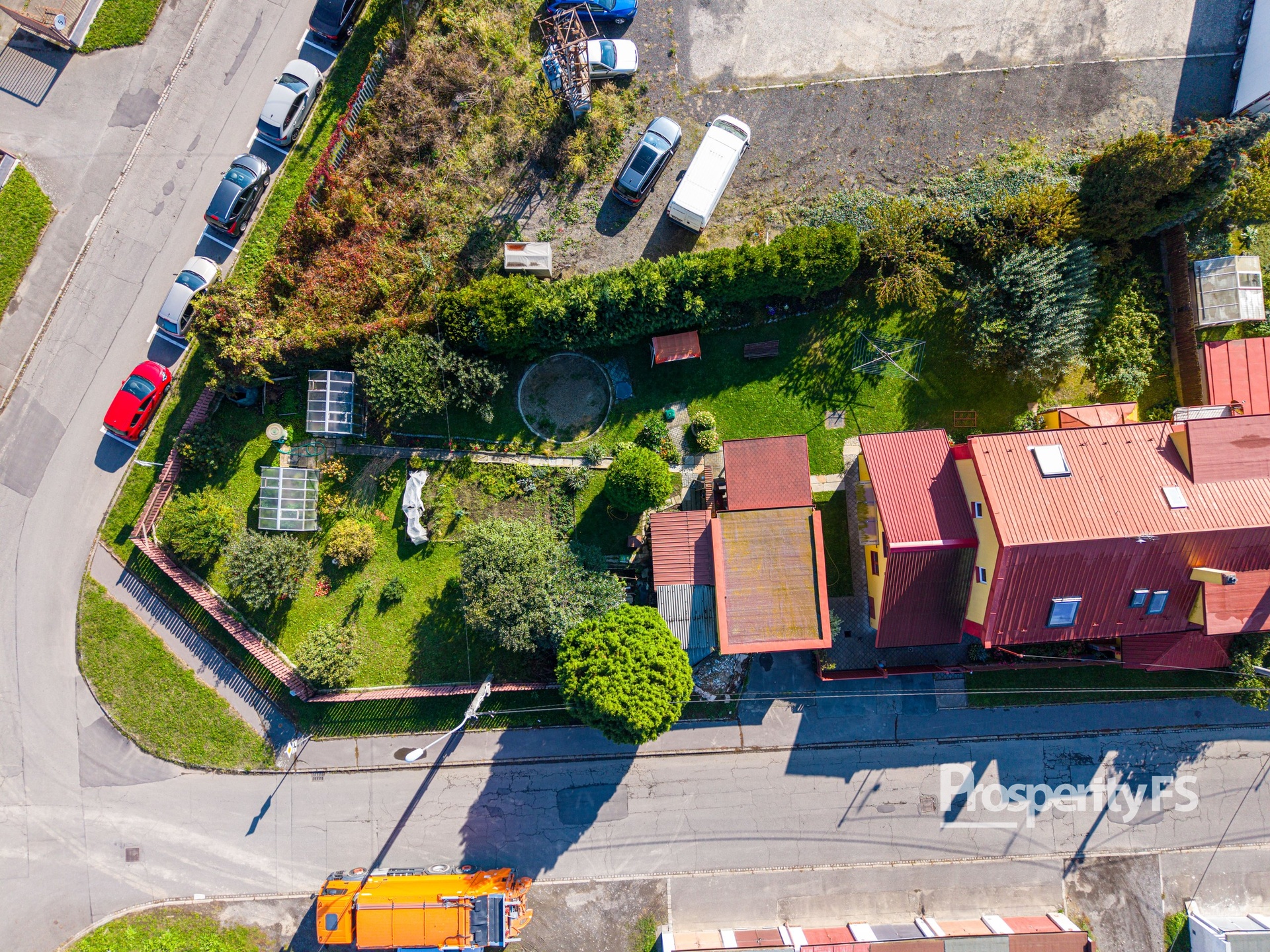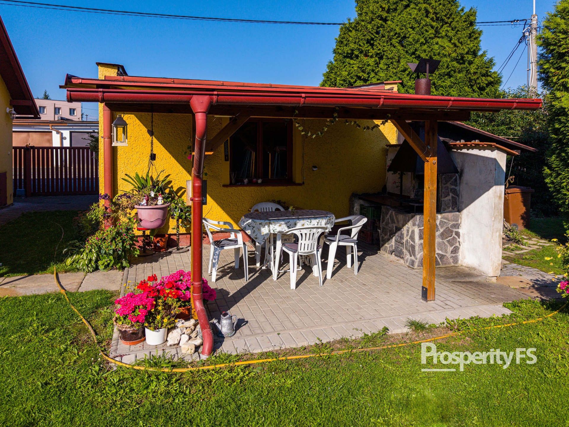 Zahrada o výměře 766 m² je pečlivě udržovaná, rovinatá a plná vzrostlých ovocných stromů. Najdete zde krásný letní altánek s posezením a krbem, kůlnu na nářadí, dva skleníky a připravené místo pro bazén. Soukromí zajišťují vzrostlé tůje.