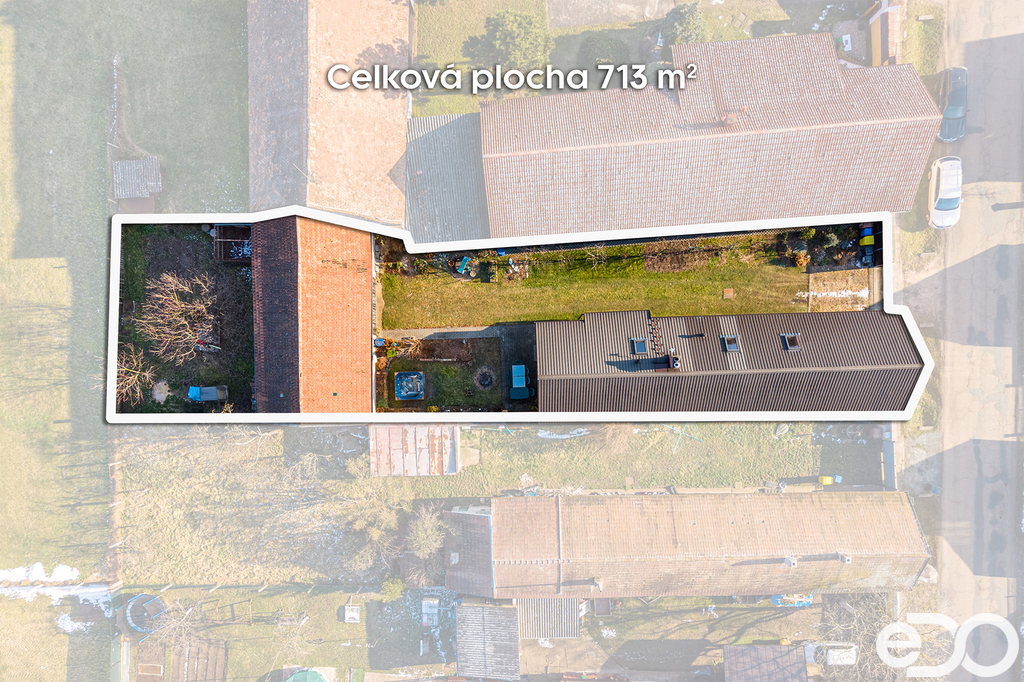 Zastavěná plocha (dům i stodola), uzavřený dvůr a zahrada za stodolou mají celkovou výměru cca 713 m². Uspořádání nabízí dostatek soukromí, prostoru pro relaxaci, zahradničení i rodinné posezení. Ve dvoře je vysázeno mnoho ovocných stromů. Součástí domu je také sklep o velikosti cca 20 m², kde je umístěn kombinovaný kotel na uhlí nebo pelety, který v zimě ohřívá vodu do bojleru a šetří tak náklady na ohřev vody. Sklep byl vybudován během rekonstrukčních prací a je vyzděný ztraceným beněním. Je tam umístěna také dílna a sklad uhlí nebo pelet.