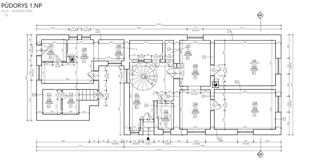 Přízemí (cca 75 m²): kuchyň s jídelním koutem, 2 pokoje, koupelna, WC, prostorné zádveří se schodištěm.