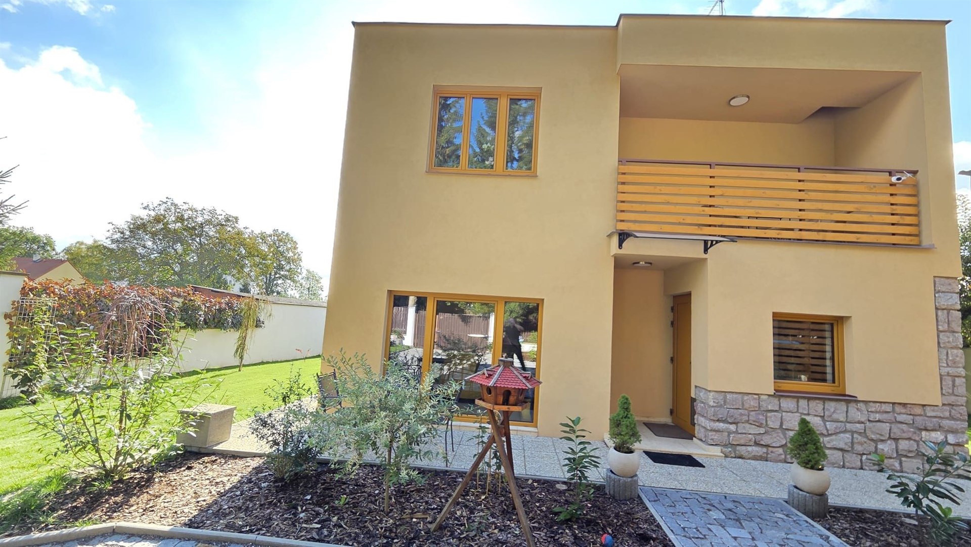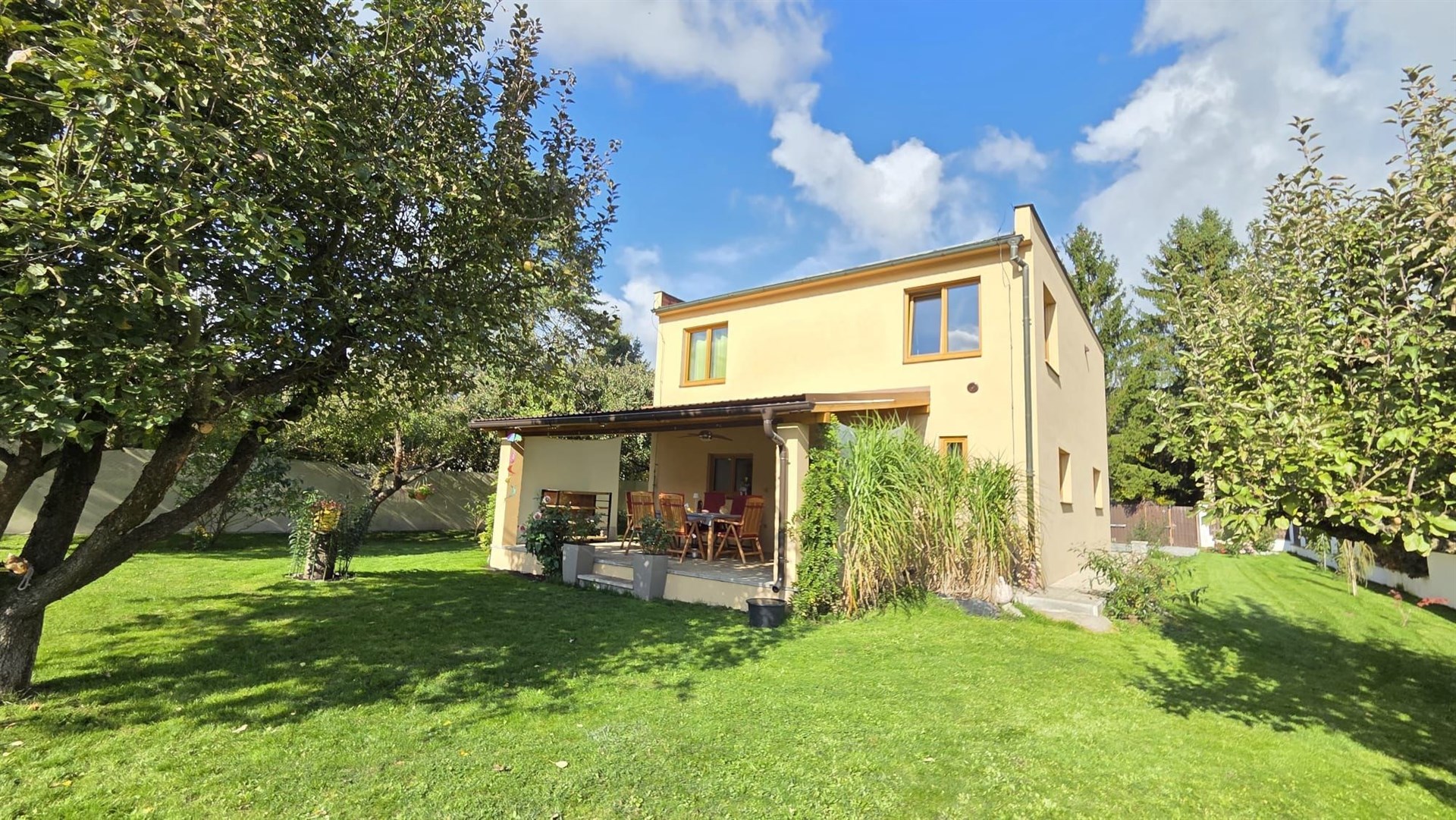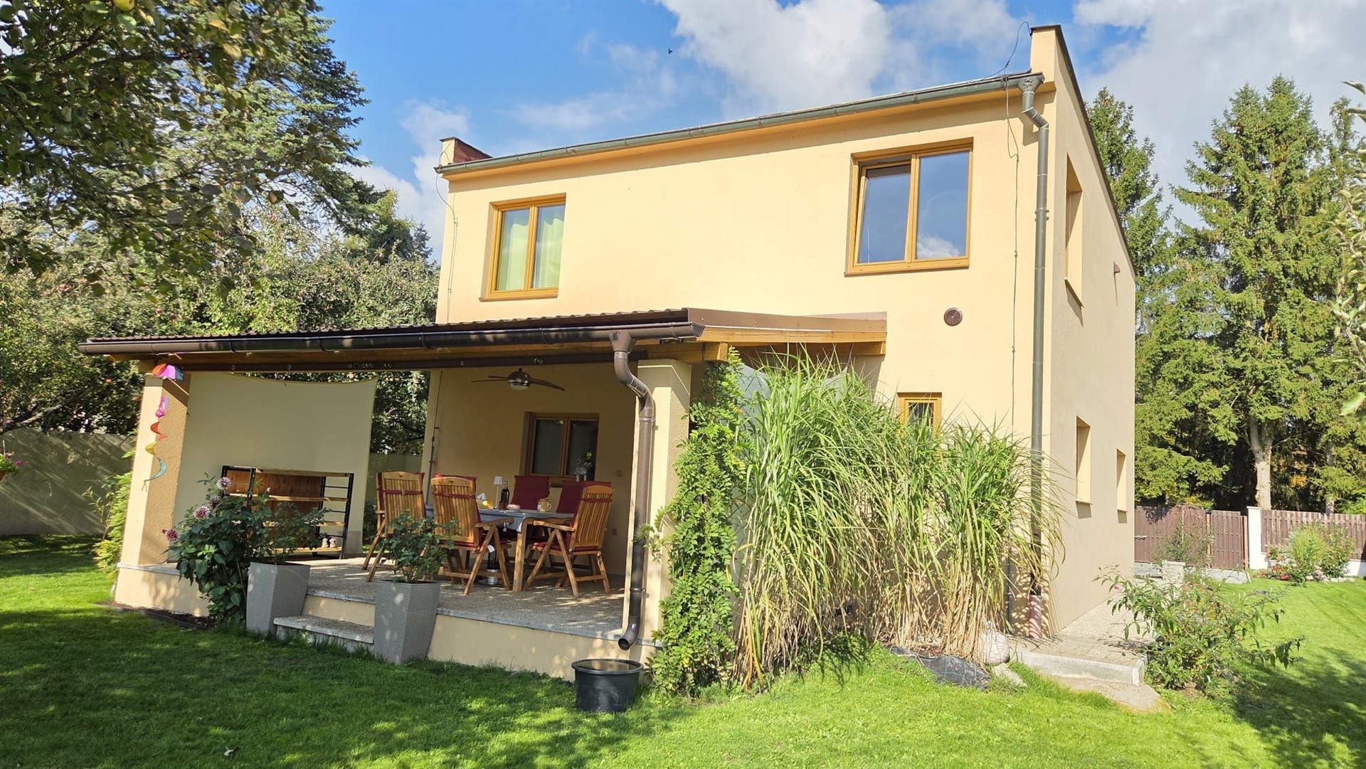 Nabízíme dvoupodlažní kompletně zrekonstruovaný rodinný dům v obci Orlík nad Vltavou (po vestavbě jedné příčky lze dům užívat jako dvougenerační se samostatnými vstupy) se zastřešenou terasou (cca 30m2) s jižní orientací směrem do klidné zahrady, zastřešeným parkovacím dvojstáním (cca 55m2) a zahradním domkem (cca 35m2). Dům s dispozicí 5+1 celkem s užitnou plochou cca 255 m2 a obytnou plochou cca 165 m2 je možno užívat jako dvougenerační neb v přízemí je obývací pokoj, ložnice, velká hala, kuchyň, vstup na krásnou zastřešenou terasu, koupelna se sprchovým koutem a samostatná toaleta a v patře je chodba, obývací pokoj, ložnice, kuchyň s jídelnou se vstupem na zastřešený balkón, koupelna s vanou a samostatná toaleta. Vestavbou jediné cca 4 m dlouhé příčky lze vstup do patra a přízemí krásně rozdělit čímž vzniknou dvě zcela samostatné bytové jednotky s vlastními vstupy s dispozicí 2+1 v každém podlaží. Před vlastní oplocenou zahradou směrem k hlavní silnici je další oplocená plocha v současné době sloužící jako prostorné parkoviště, kterou je díky své poloze možnou užít ke komerčnímu záměru jako například k provozování stánku rychlého občerstvení či prodeje zmrzliny apod. Dům se zastavěnou plochou 91 m2, na vlastním pozemku o velikosti 1050 m2, má vlastní studnu, obecní kanalizační přípojku a elektrika je i 380. Na zahradě je dvoukubíková retenční nádrž na zalévání. Topení v domě je všude podlahové a dokonce i ve stropech. Vytápění je zajištěno nejen elektrokotlem Protherm, ale i dřevosplyňovacím kotlem Atmos – lze libovolně kombinovat. Podlahy jsou moderní stěrkové, vinylové a dřevěné. Okna jsou nová plastová. Občanská vybavenost v obci: Coop, večerka, 2 restaurace plus jedna u zámku a další 2 u mostu, benzinka, zámek, zámecký park, přehrada, parníky, přístaviště lodí Mariny, plachtění, koupání, rybaření, 3 okresní města ve vzdálenosti 30 km. Vynikající dostupnost do Prahy je nyní převážně po dálnici cca 50 minut.
