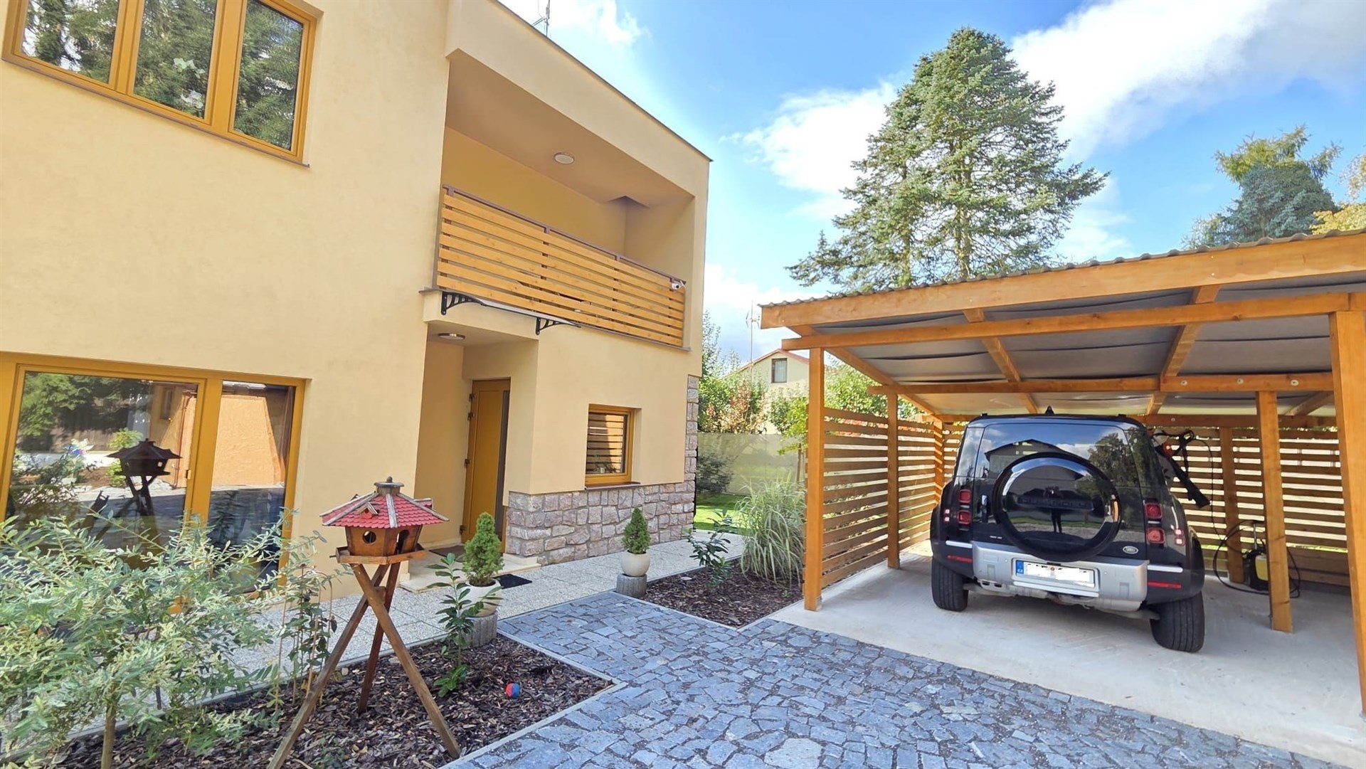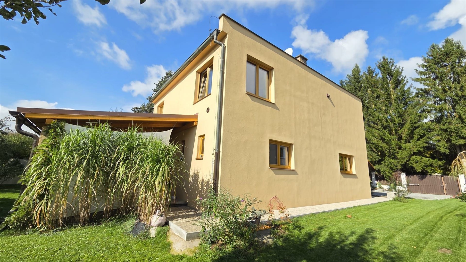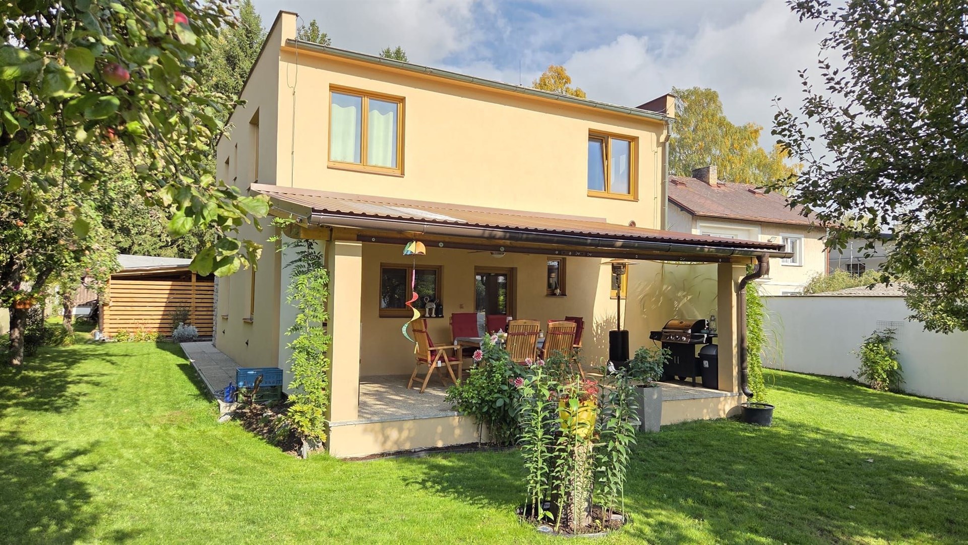 Nabízíme dvoupodlažní kompletně zrekonstruovaný rodinný dům v obci Orlík nad Vltavou (po vestavbě jedné příčky lze dům užívat jako dvougenerační se samostatnými vstupy) se zastřešenou terasou (cca 30m2) s jižní orientací směrem do klidné zahrady, zastřešeným parkovacím dvojstáním (cca 55m2) a zahradním domkem (cca 35m2). Dům s dispozicí 5+1 celkem s užitnou plochou cca 255 m2 a obytnou plochou cca 165 m2 je možno užívat jako dvougenerační neb v přízemí je obývací pokoj, ložnice, velká hala, kuchyň, vstup na krásnou zastřešenou terasu, koupelna se sprchovým koutem a samostatná toaleta a v patře je chodba, obývací pokoj, ložnice, kuchyň s jídelnou se vstupem na zastřešený balkón, koupelna s vanou a samostatná toaleta. Vestavbou jediné cca 4 m dlouhé příčky lze vstup do patra a přízemí krásně rozdělit čímž vzniknou dvě zcela samostatné bytové jednotky s vlastními vstupy s dispozicí 2+1 v každém podlaží. Před vlastní oplocenou zahradou směrem k hlavní silnici je další oplocená plocha v současné době sloužící jako prostorné parkoviště, kterou je díky své poloze možnou užít ke komerčnímu záměru jako například k provozování stánku rychlého občerstvení či prodeje zmrzliny apod. Dům se zastavěnou plochou 91 m2, na vlastním pozemku o velikosti 1050 m2, má vlastní studnu, obecní kanalizační přípojku a elektrika je i 380. Na zahradě je dvoukubíková retenční nádrž na zalévání. Topení v domě je všude podlahové a dokonce i ve stropech. Vytápění je zajištěno nejen elektrokotlem Protherm, ale i dřevosplyňovacím kotlem Atmos – lze libovolně kombinovat. Podlahy jsou moderní stěrkové, vinylové a dřevěné. Okna jsou nová plastová. Občanská vybavenost v obci: Coop, večerka, 2 restaurace plus jedna u zámku a další 2 u mostu, benzinka, zámek, zámecký park, přehrada, parníky, přístaviště lodí Mariny, plachtění, koupání, rybaření, 3 okresní města ve vzdálenosti 30 km. Vynikající dostupnost do Prahy je nyní převážně po dálnici cca 50 minut.