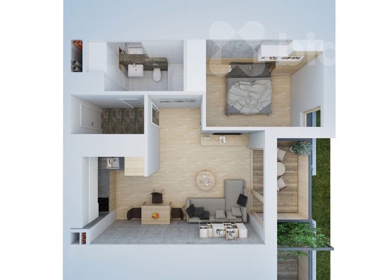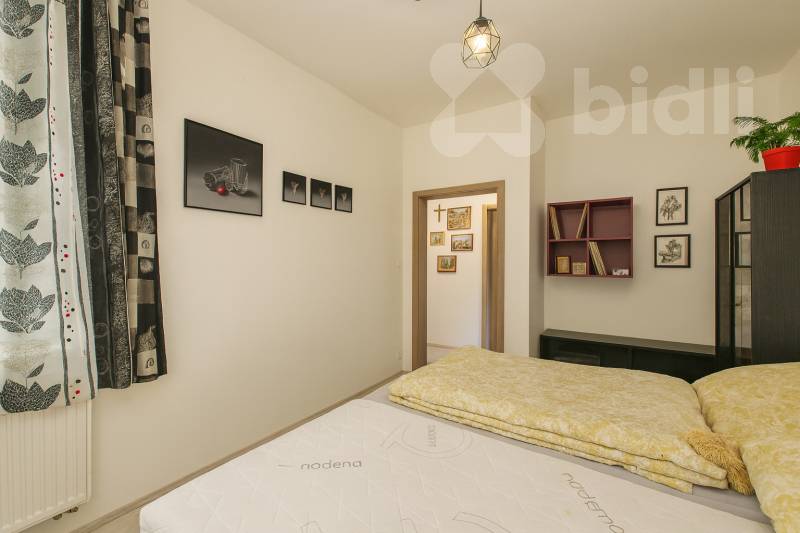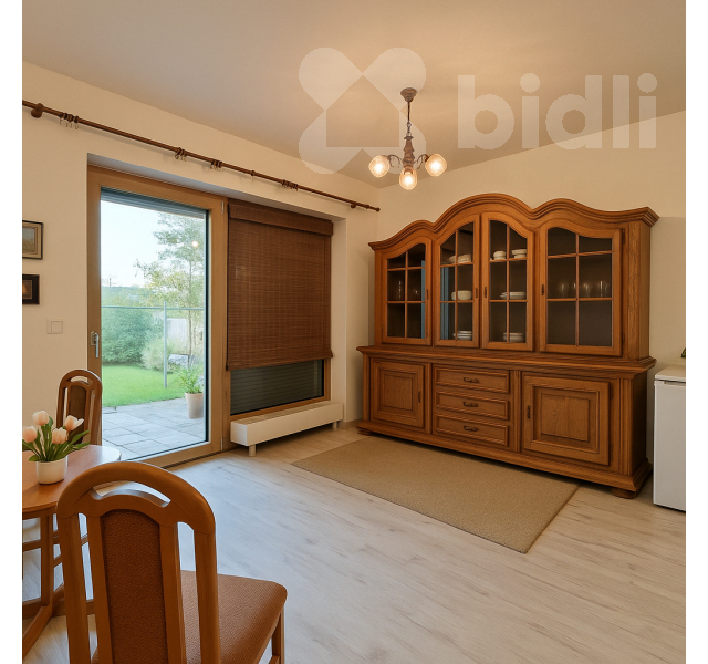 Dispozici tvoří prostorný obývací pokoj s kuchyňským koutem, ze kterého je přímý vstup na slunnou terasu se zahrádkou, dále ložnice a koupelna se sprchovým koutem a toaletou. Byt je prostorný, světlý a s výbornou energetickou náročností třídy B a nízkými provozními náklady.