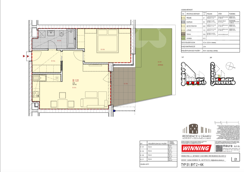 Nabízíme k prodeji krásný, světlý byt o dispozici 2+kk a výměře 50 m2, který se nachází v přízemí novostavby Rezidence u zámku v samém srdci Oslavan. Jeho součástí je prostorná terasa se zahrádkou o výměře 28 m2. K bytu je možné zakoupit parkovací stání přímo před domem.