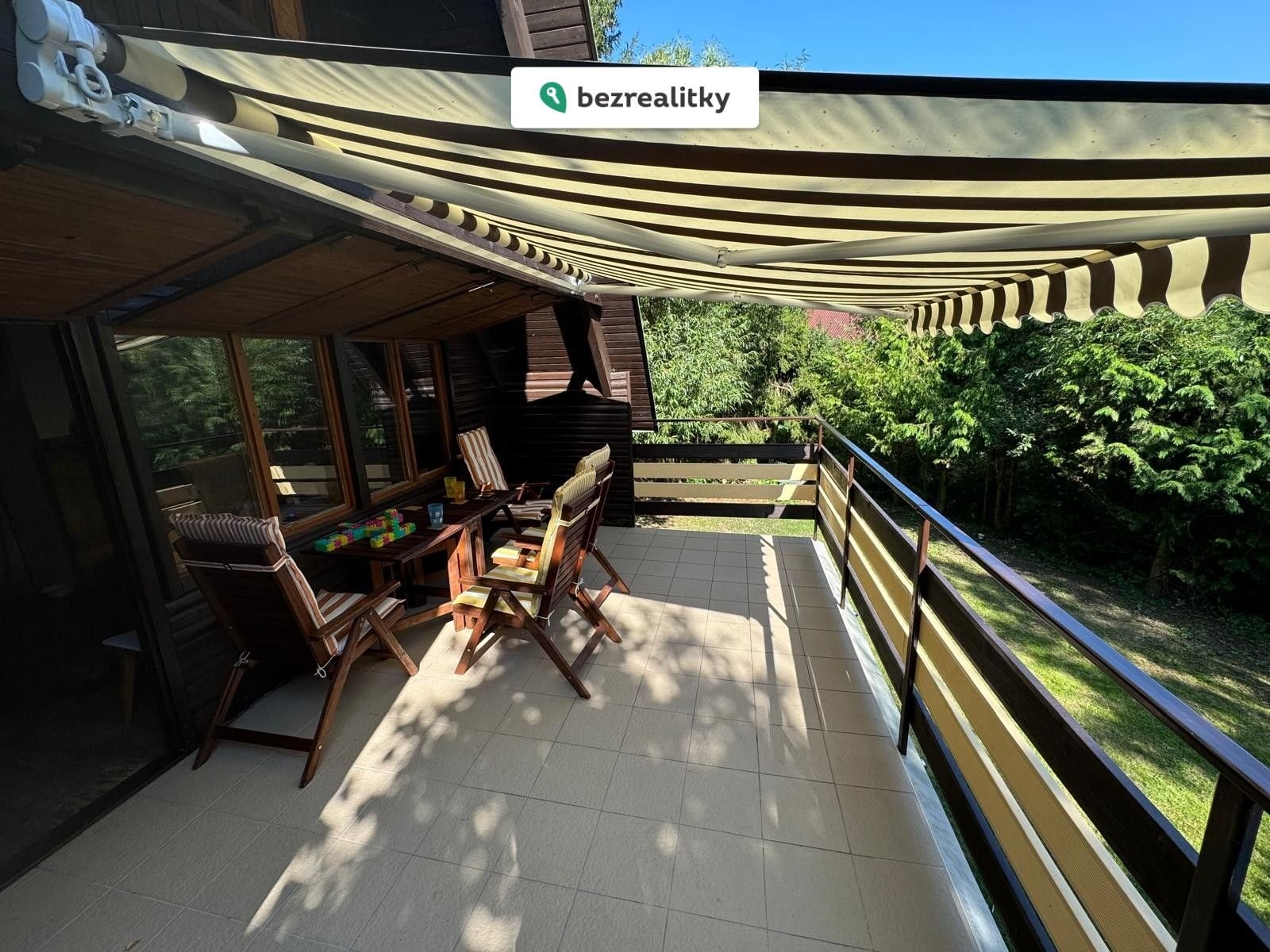 Posezení na terase je z Teakového dřeva včetně stolu, které v letním slunci chrání výsuvná markýza.