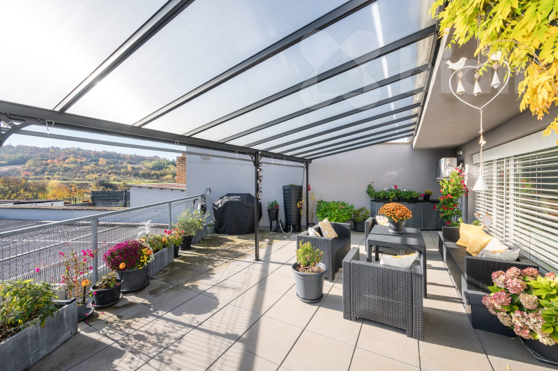 Dominantou tohoto podlaží je však prostorná terasa o velikosti 49 m², která plynule navazuje na interiér a otevírá dechberoucí výhled do zahrady a okolního lesa. Ideální místo pro ranní kávu i večerní společenské události.