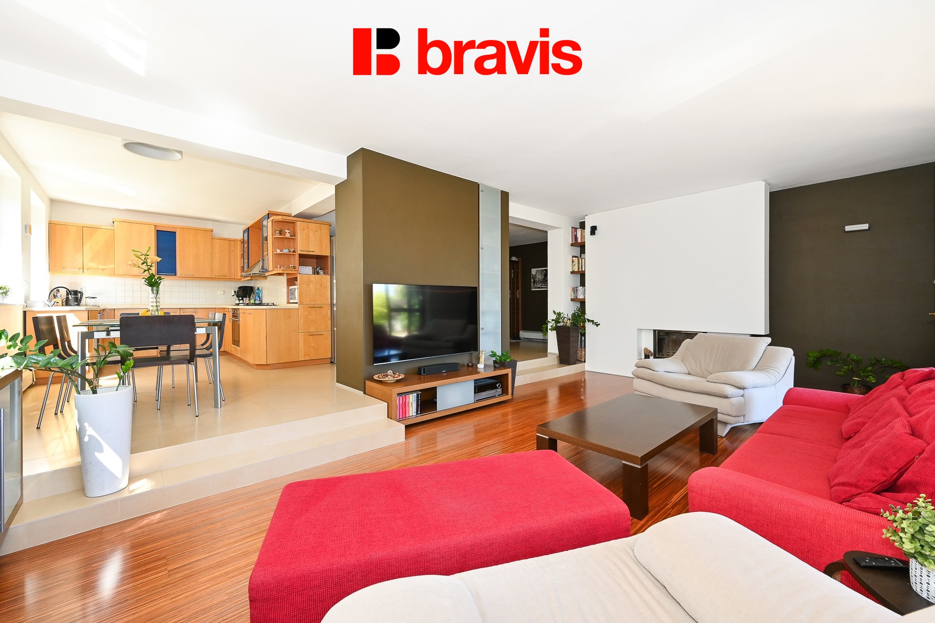 • mimořádně prostorný obývací pokoj s krbem propojený s kuchyní, maximálně využívající prostor a světlo