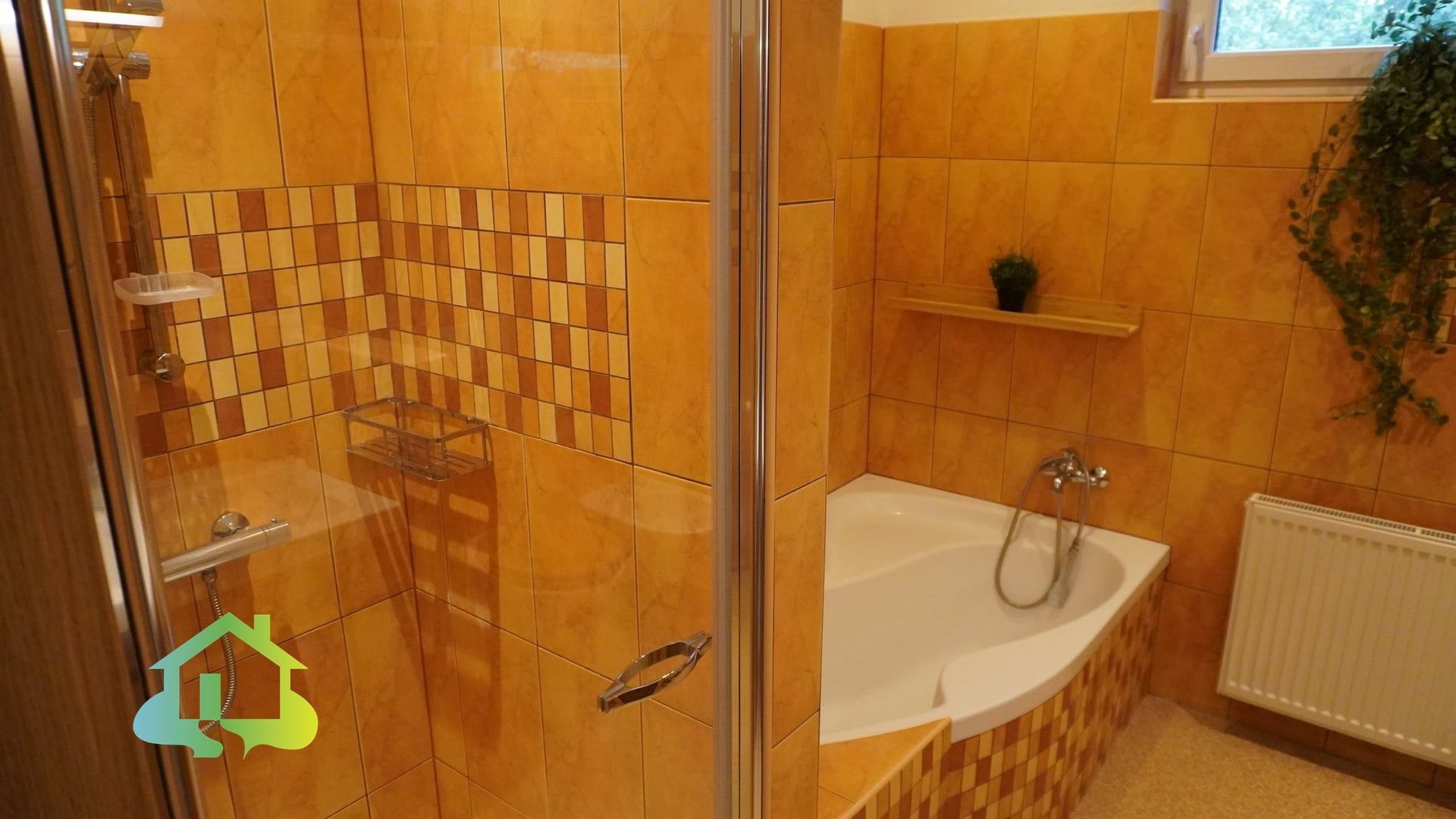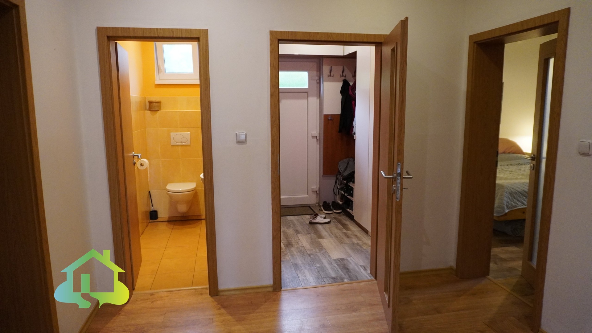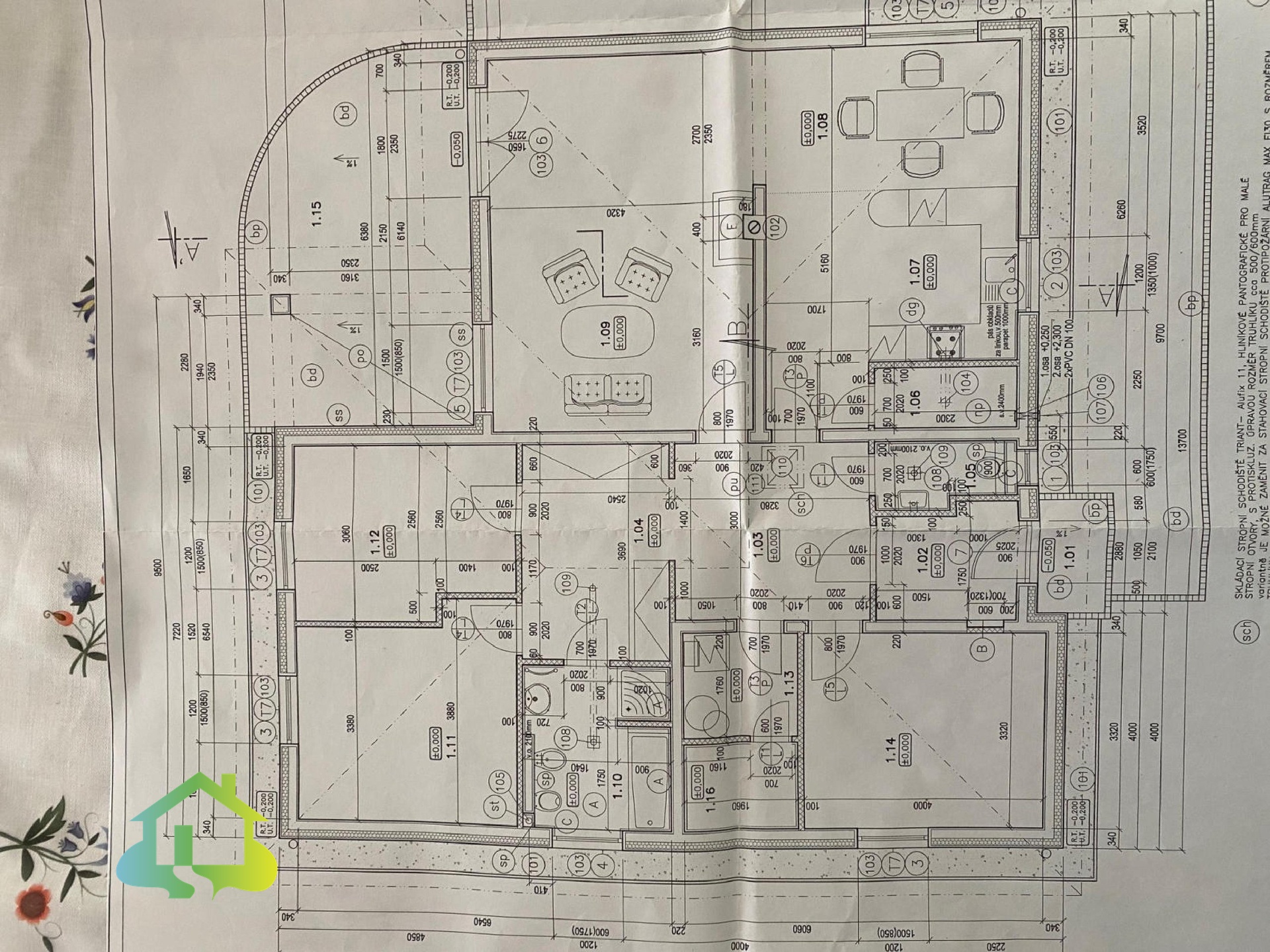 Podlahy jsou řešeny kombinací PVC a keramické dlažby. Plastová okna jsou osazena izolačními dvouskly.