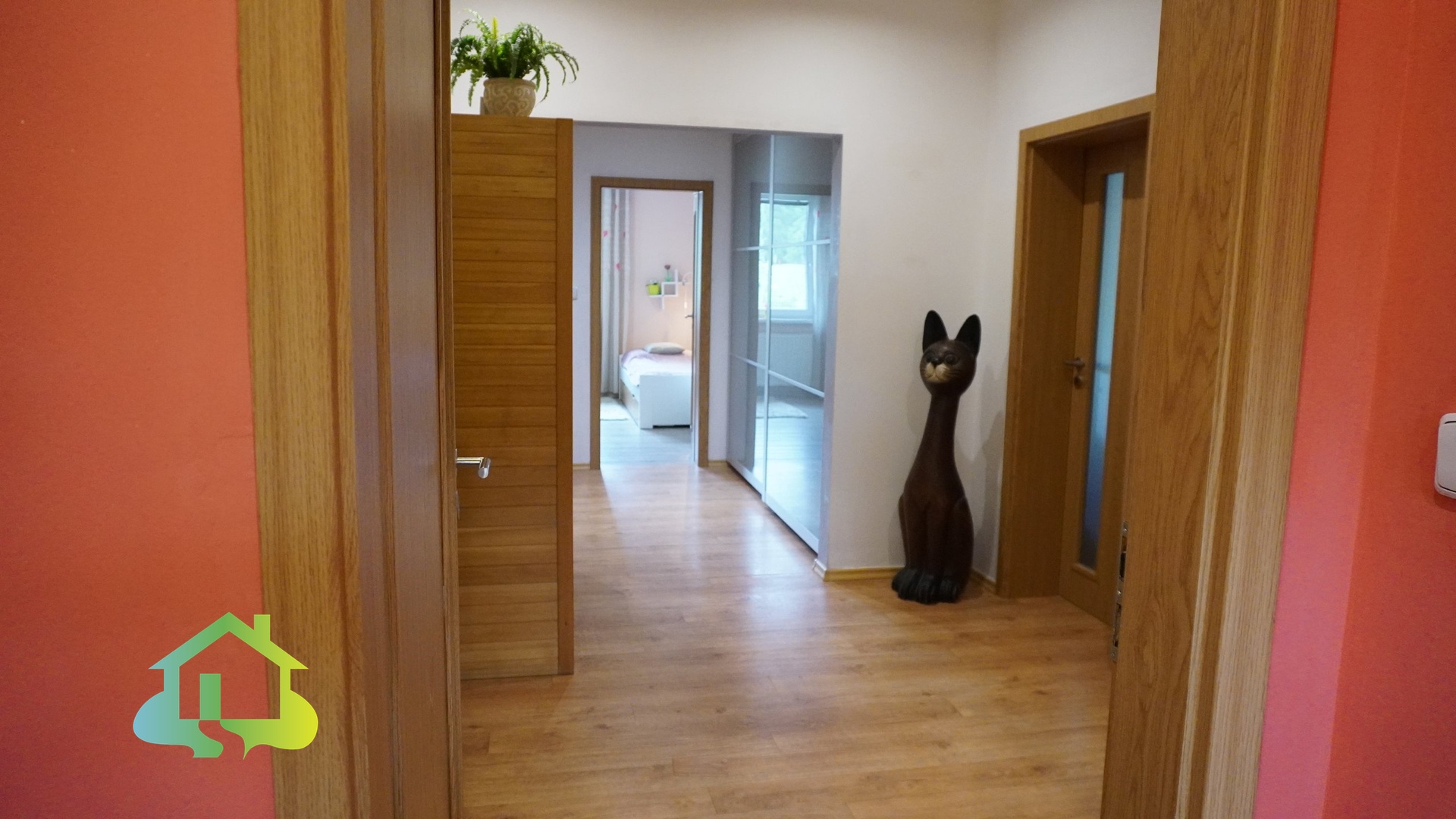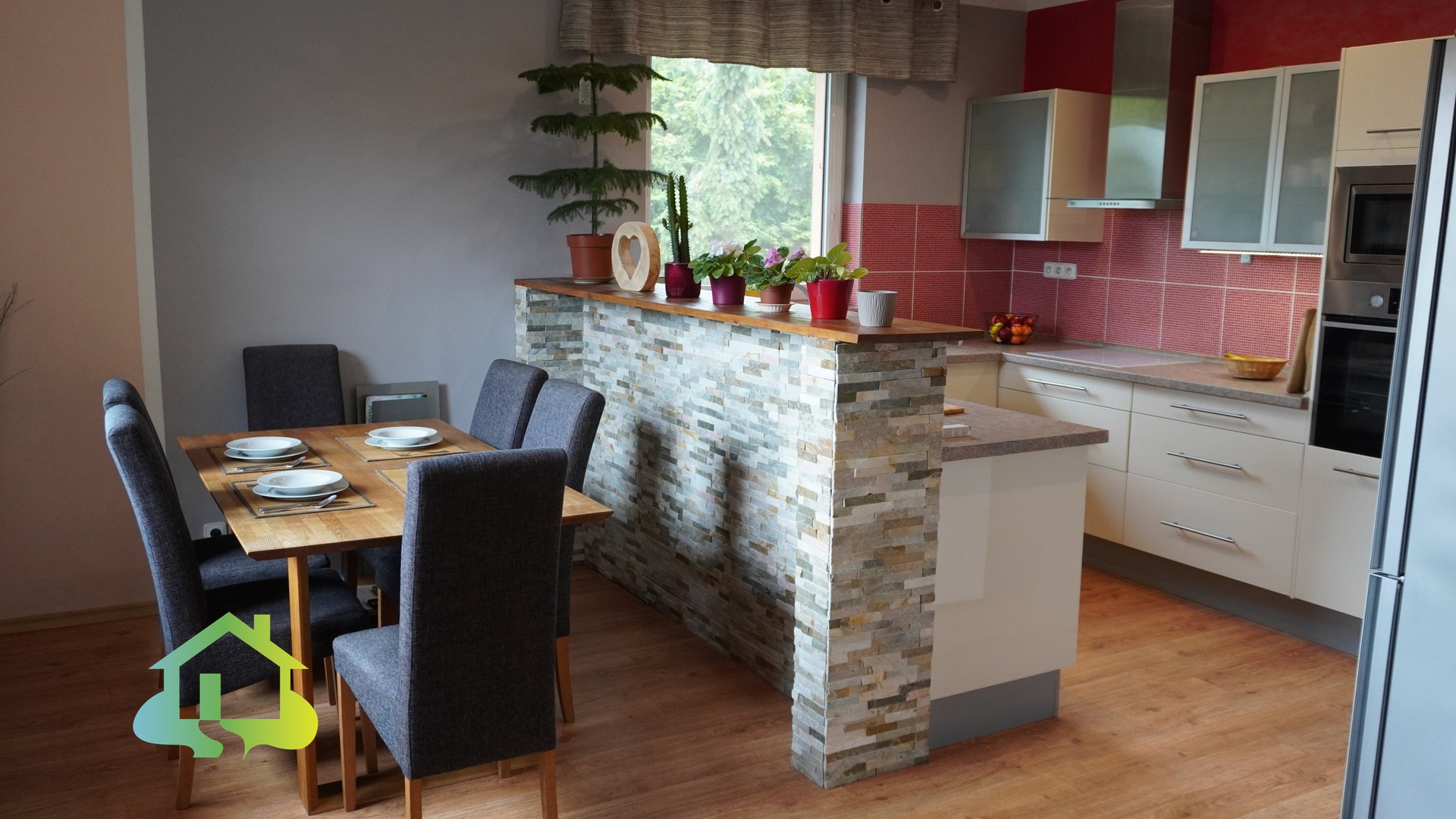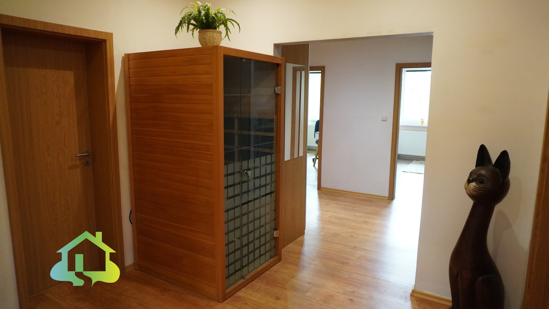 Dispozice domu je prakticky řešená – ze zádveří vstupujete do centrální haly, odkud se dostanete do kuchyně s vlastní spíží. Na kuchyni navazuje částečně oddělený obývací pokoj s krbovými kamny a přímým vstupem na terasu přes francouzské dveře. Dále dům nabízí ložnici, dva dětské pokoje, koupelnu s vanou i sprchovým koutem, WC s bidetem, samostatné WC, technickou místnost a saunu.