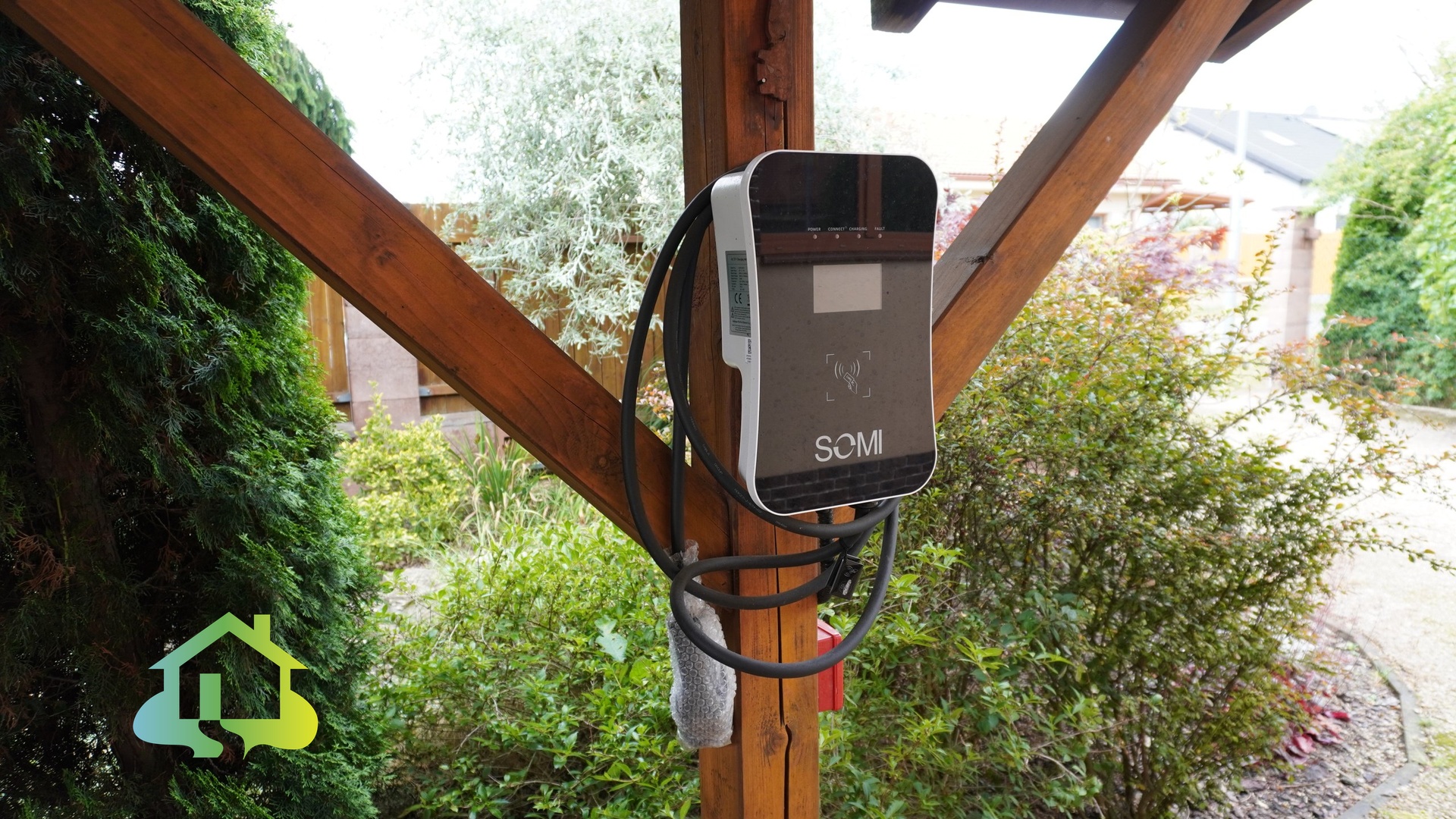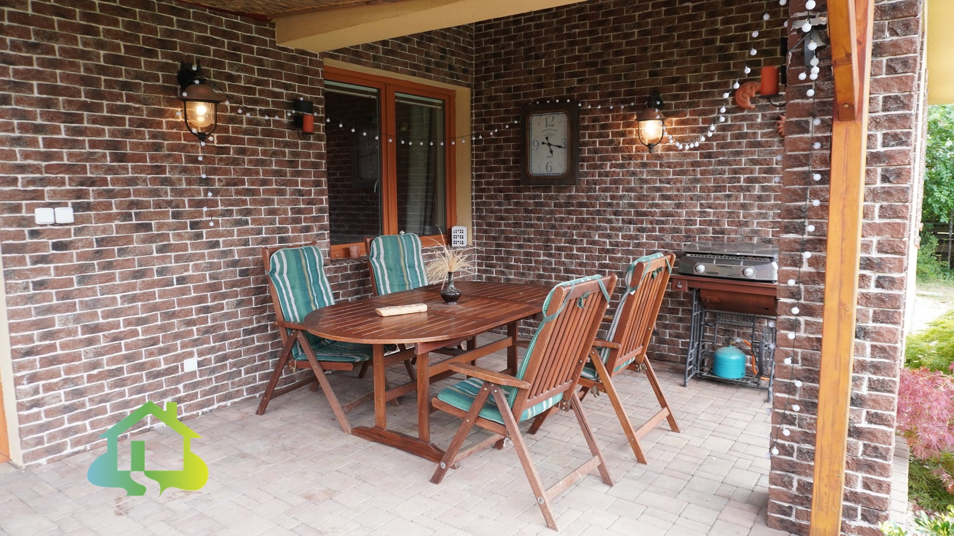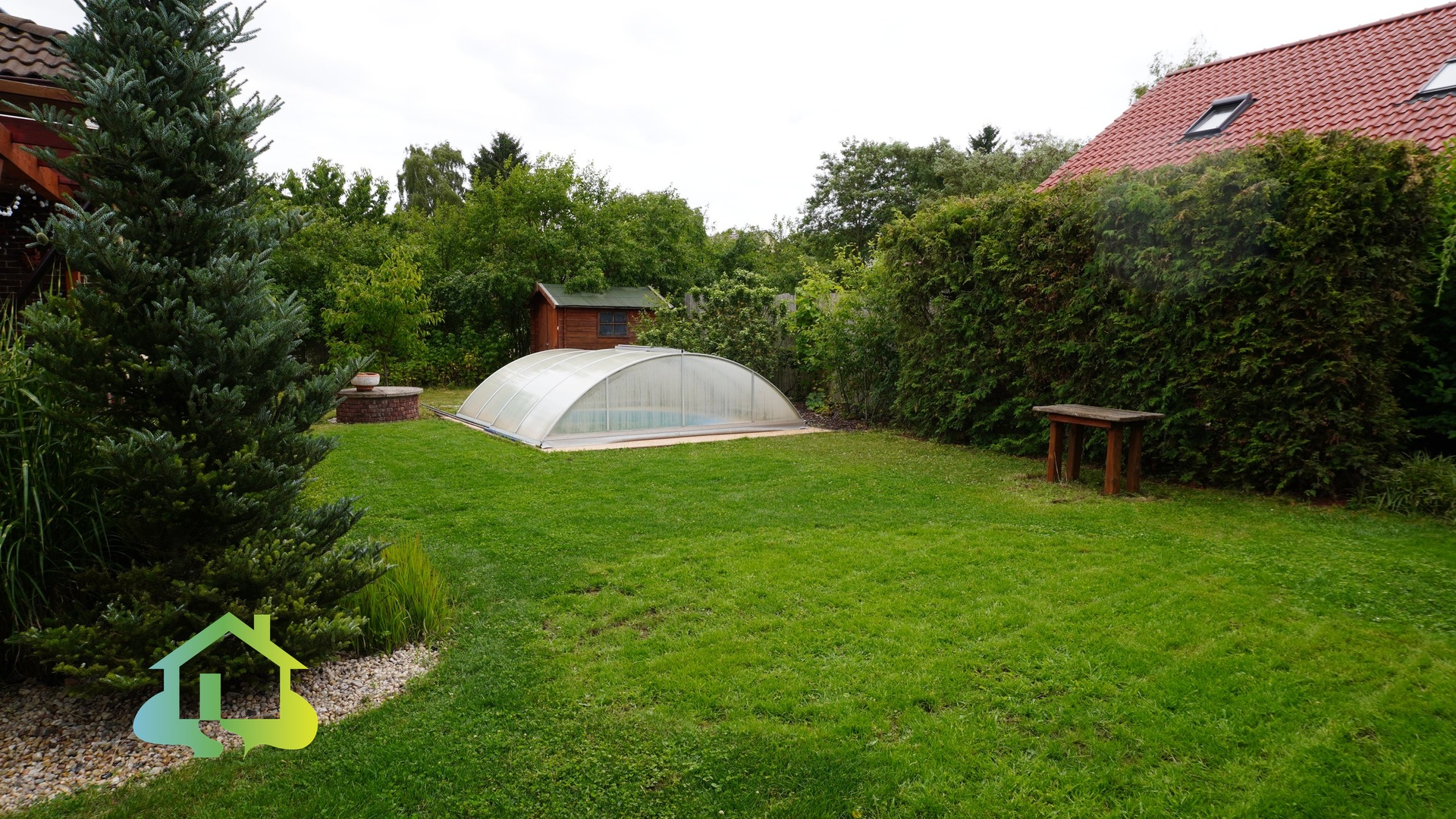 Součástí udržované zahrady je zastřešená terasa, bazén s filtrací a zatahovací střechou, zahradní domek a zastřešené parkovací stání s elektrickou vjezdovou bránou.