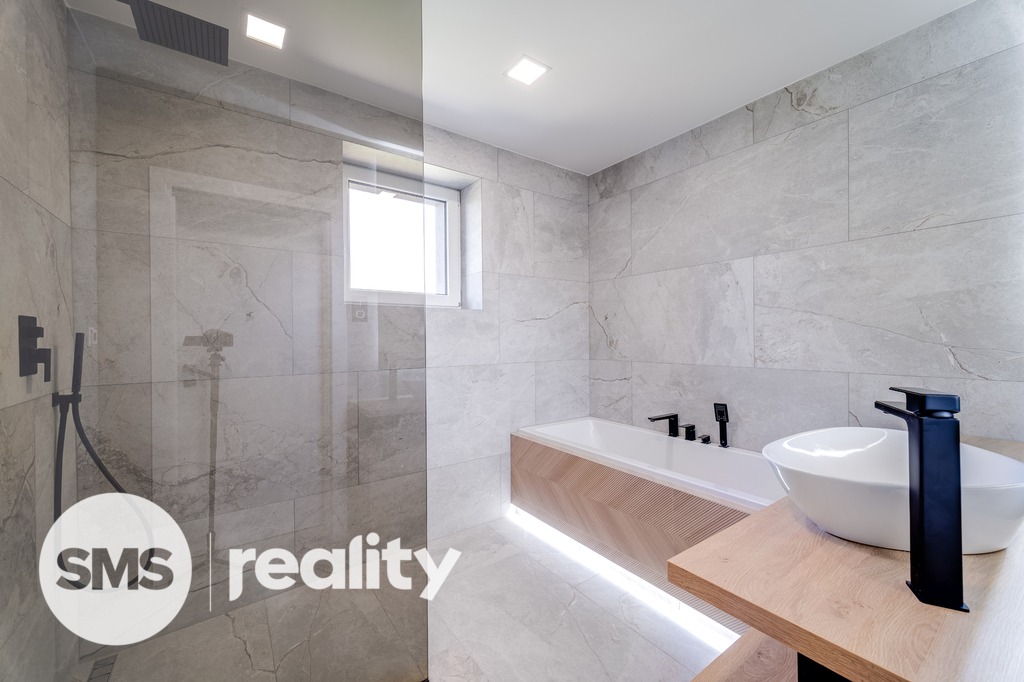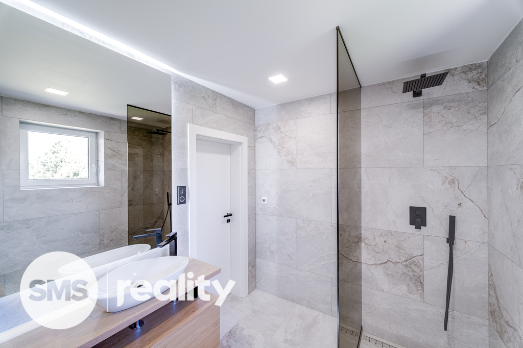 V přízemí vás přivítá reprezentativní vstupní hala, velkorysý obytný prostor s kuchyní, jídelnou a obývacím pokojem, doplněný pracovnou a koupelnou vybavenou vanou i sprchovým koutem. V patře se nacházejí tři samostatné ložnice a druhá koupelna se sprchou. Kuchyňská linka na míru je plně osazena špičkovými spotřebiči Bosch. Koupelny jsou vybaveny elektrickými topnými rohožemi pro maximální komfort.