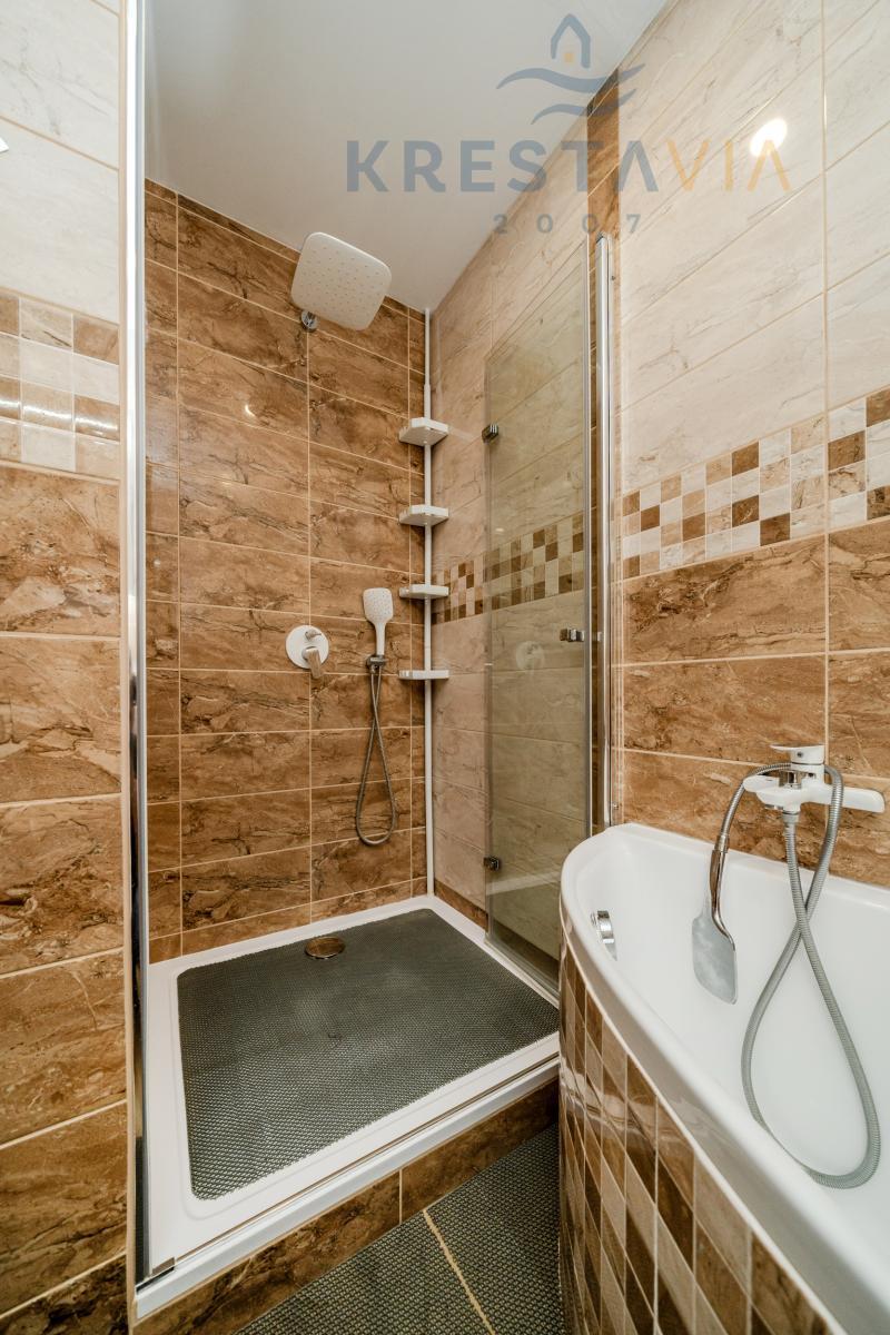 Velká rohová vana i sprchový kout s dostatečným místem pro pohyb, pračku a uložení věcí ve zděné polici.