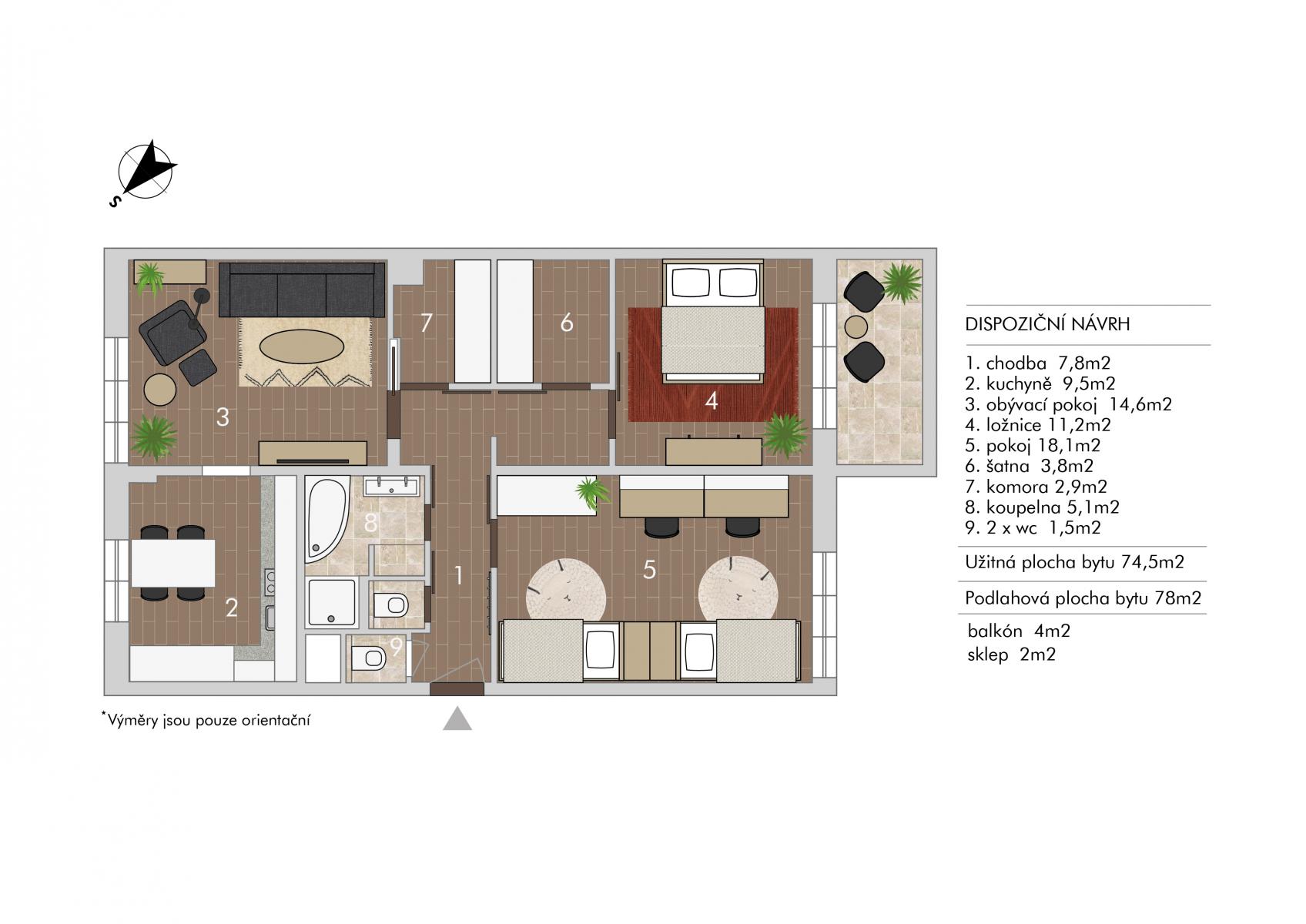 Nadstandartní byt 3+1, 78m2, s 2 wc, sprchovým koutem i vanou, šatnou a balkónem