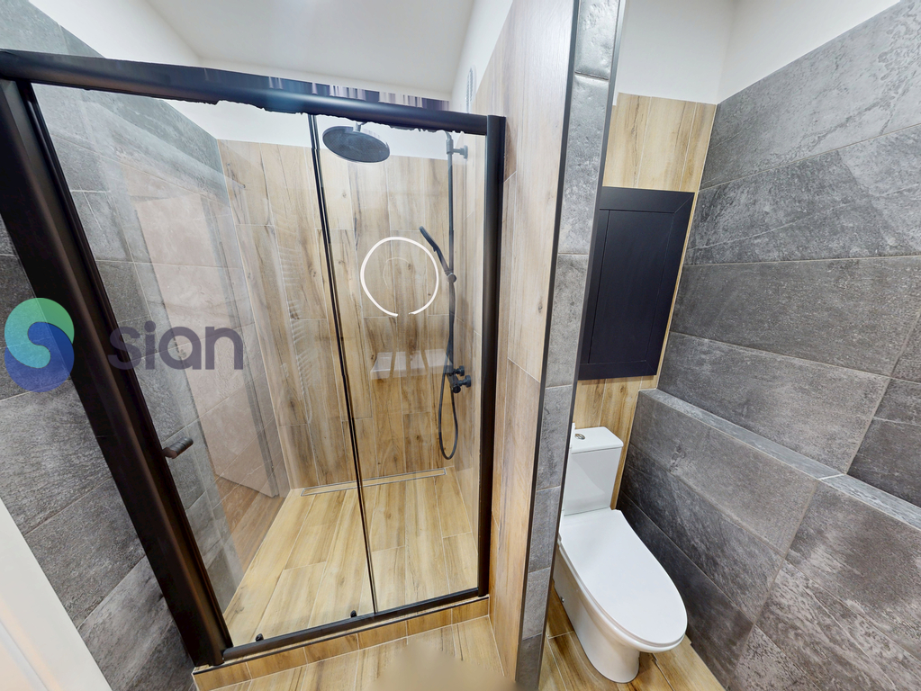 V koupelně najdete sprchový kout, moderní umyvadlovou skříňku a zrcadlo. Celý byt působí čistě, vkusně a svěže. Velkým benefitem jsou venkovní elektrické rolety, které zajišťují pohodlí i soukromí.