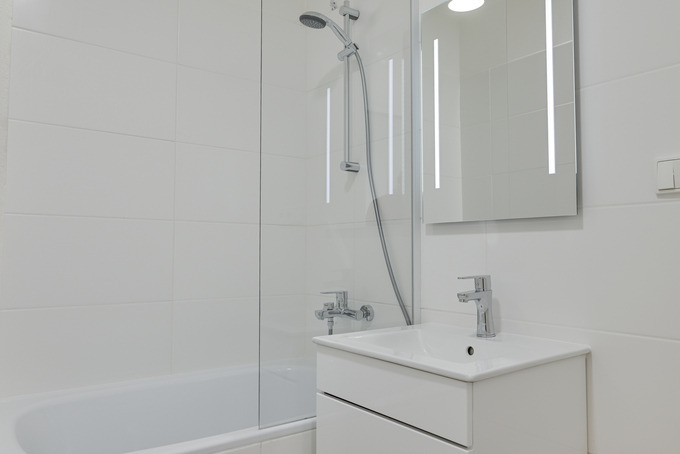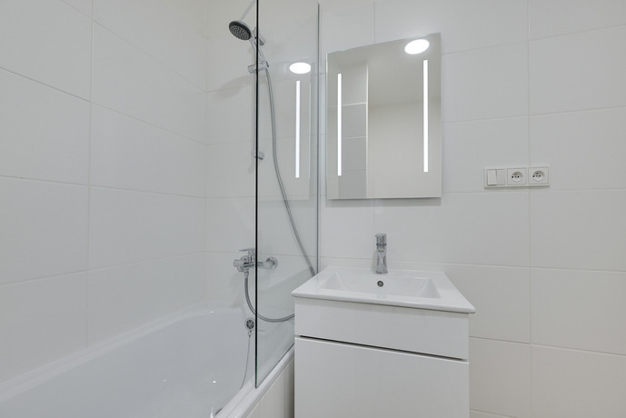 Koupelna je vybavena vanou, umyvadlem s praktickou vestavěnou skříňkou, toaleta je součástí koupelny. Prostor pro pračku je v koupelně.
