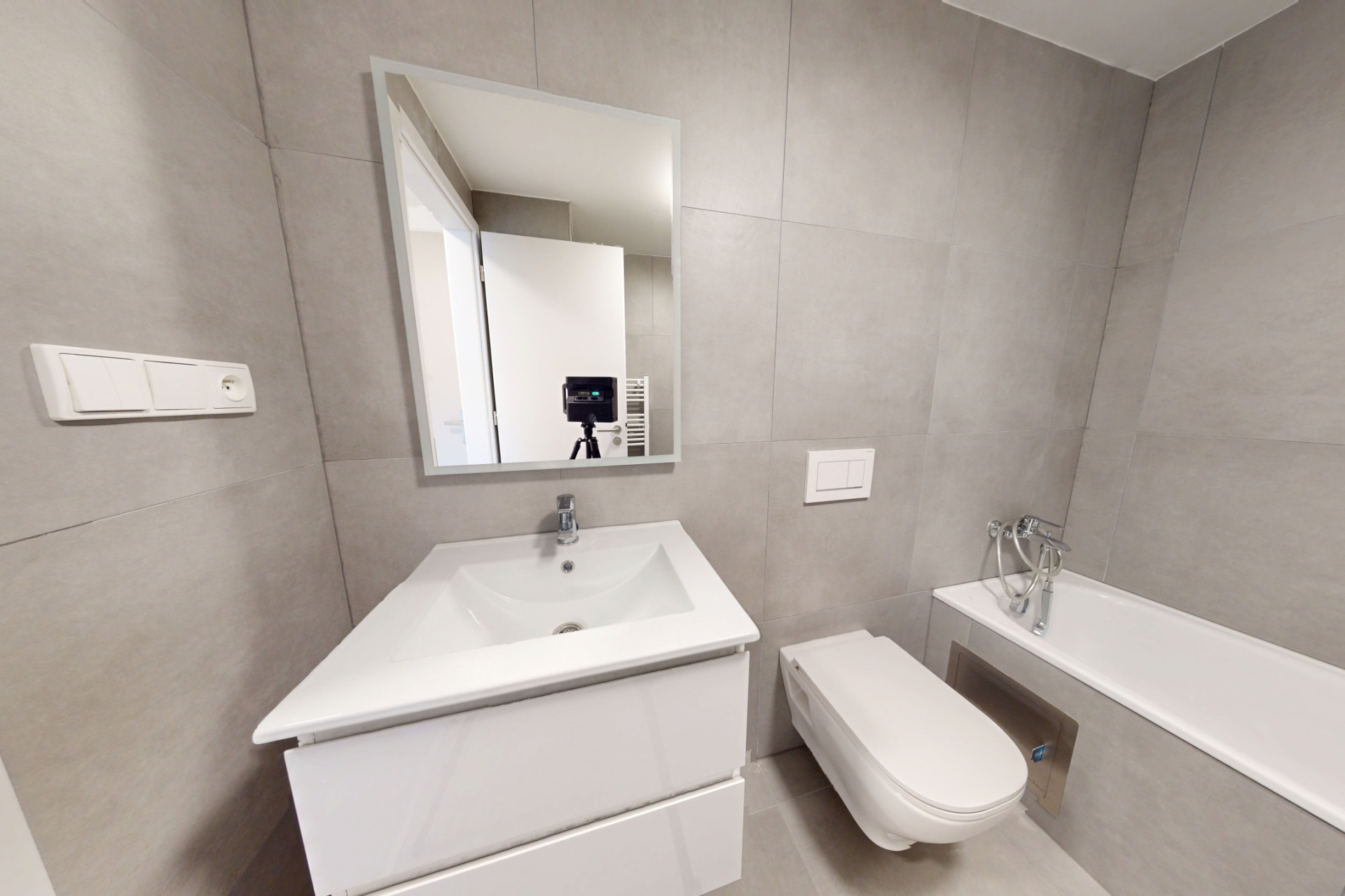 Koupelna je řešena v moderním stylu s vanou, toaletou a umyvadlovou skříňkou se zrcadlem. Celý byt působí vzdušně, svěže a je navržen s důrazem na efektivní využití prostoru.