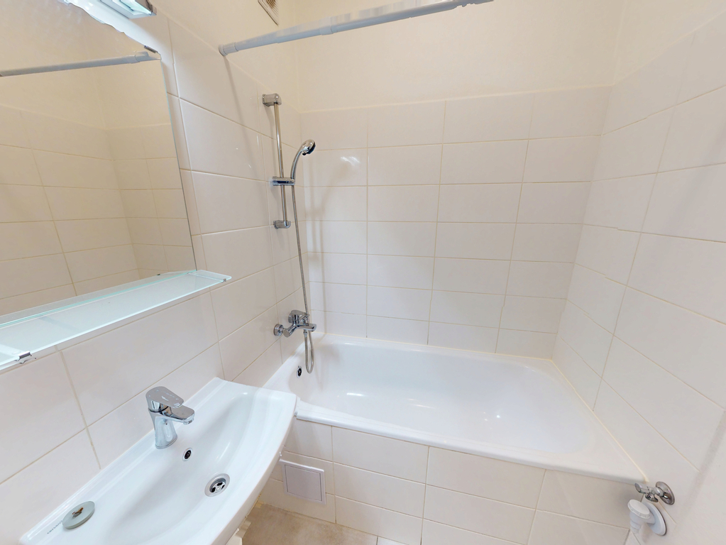 Koupelna s vanou a umyvadlem s možností připojení pračky, toaleta je odděleně. Kuchyňská linka je opatřena plynovým sporákem a elektrickou troubou s možností připojení pračky nebo myčky.