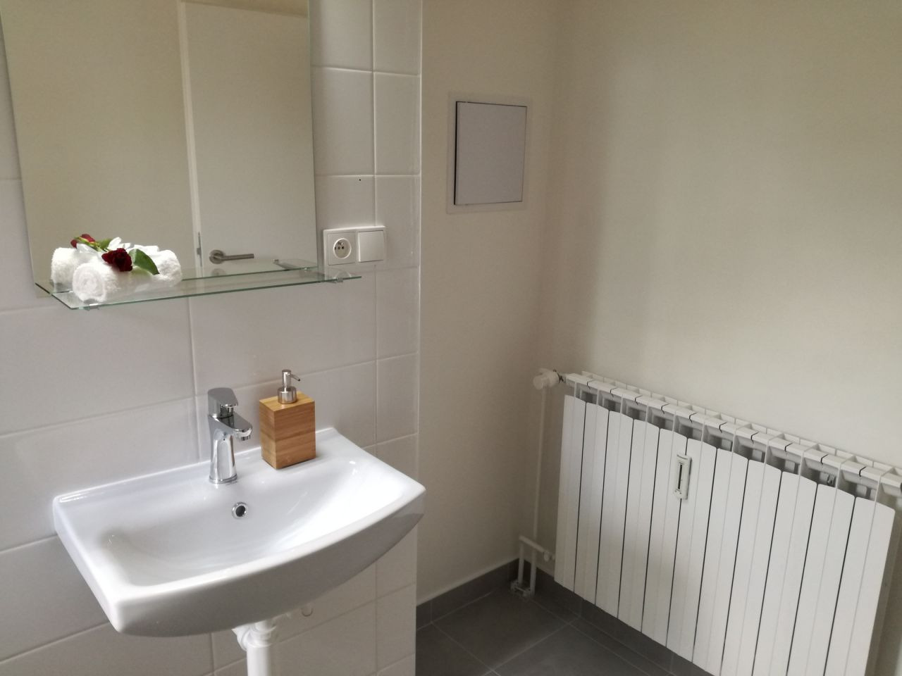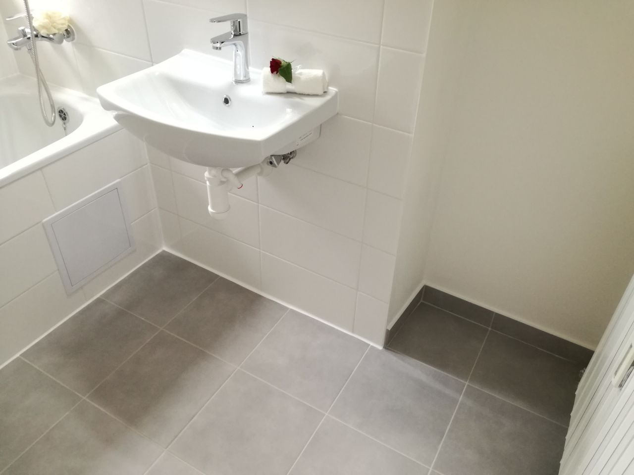 Prostorná koupelna s vanou a umyvadlem a s možností připojení pračky, toaleta je odděleně.