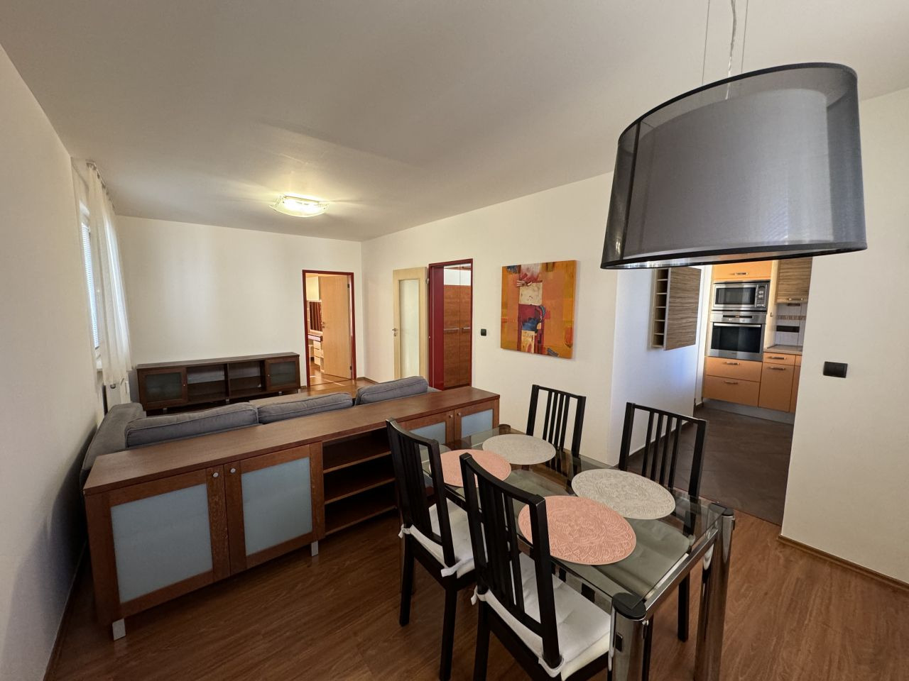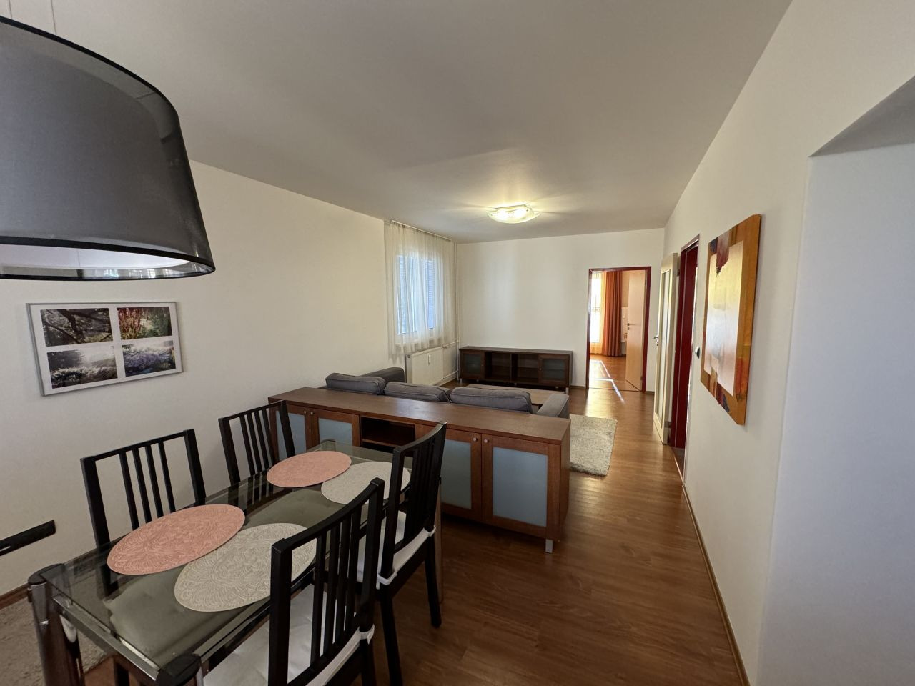 V obývacím pokoji se nachází sedací souprava, komody, konferenční stůl a koberec. Sedačka odděluje obývací část od jídelní, kde je jídelní stůl a židle.