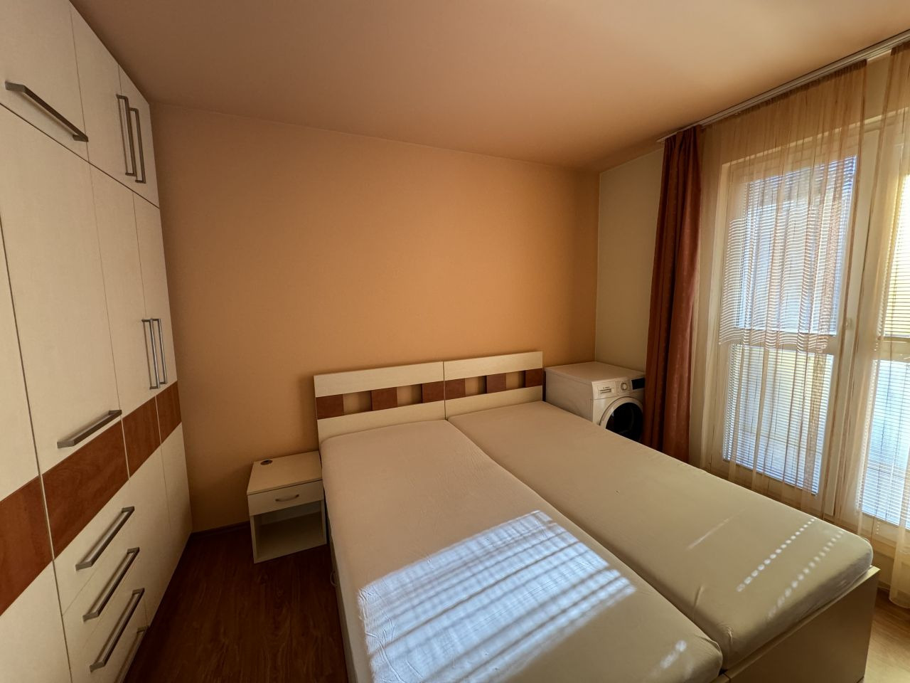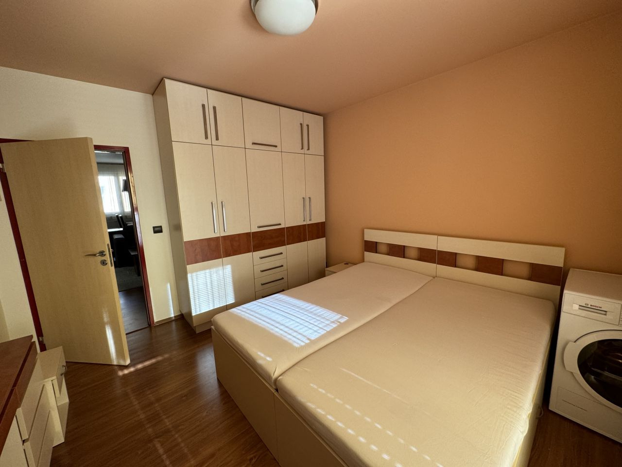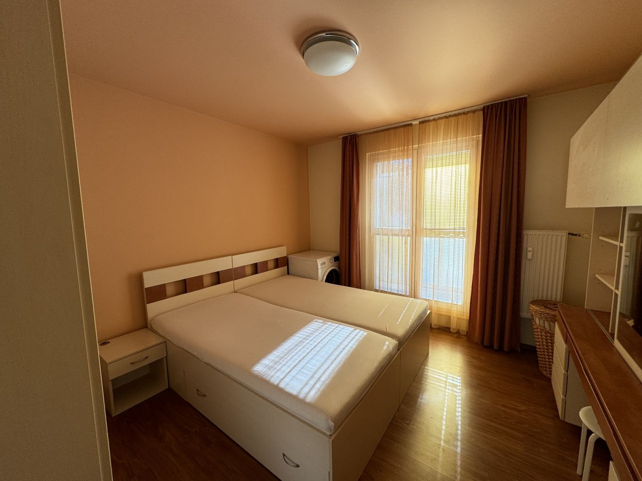V ložnici je velká postel, skříně, sušička a vstup na prostornou lodžii.