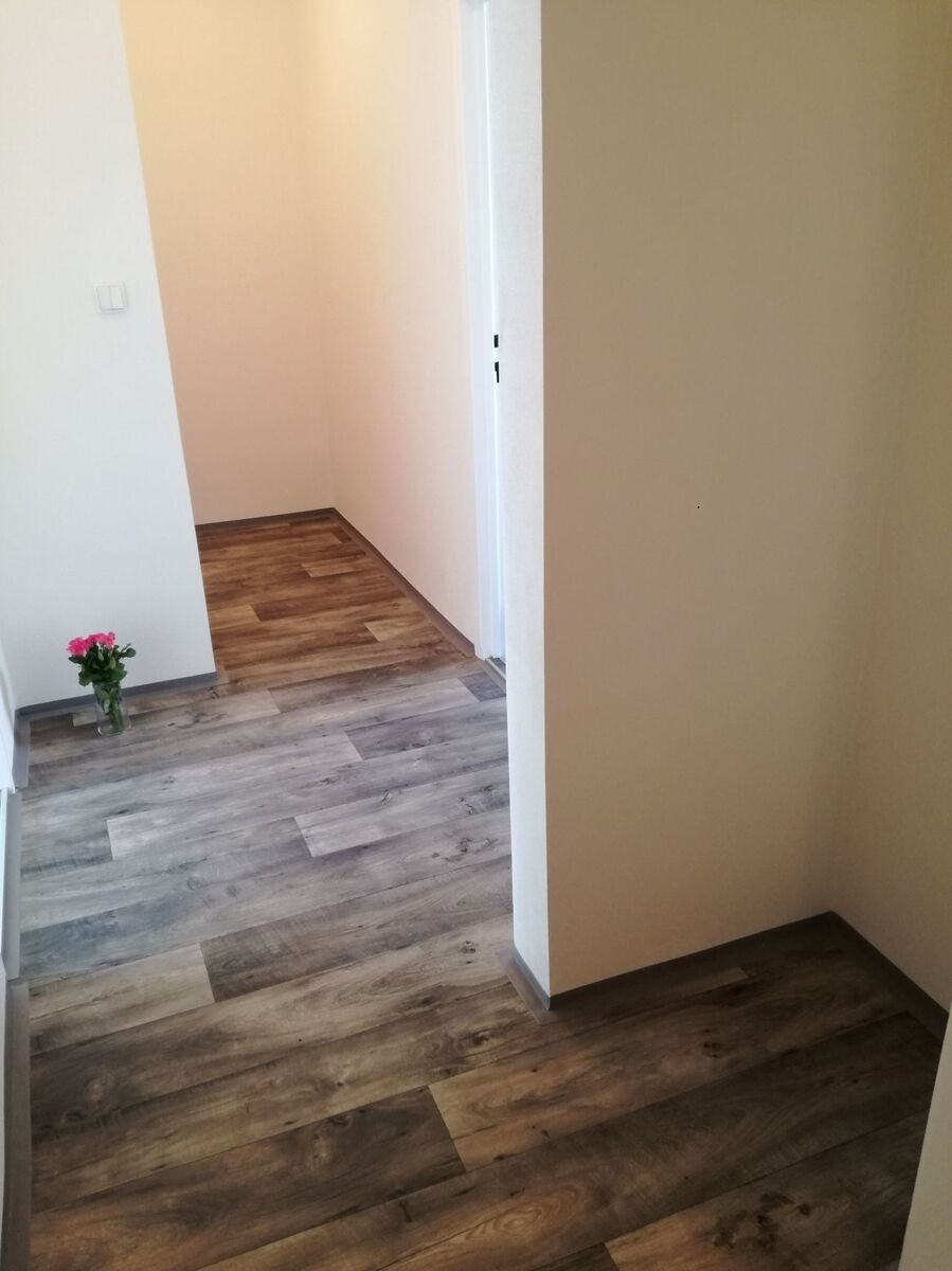 Byt má vyzděné jádro, podlahy, rozvody, omítky, interiérové dveře. Koupelna s vanou a umyvadlem s možností připojení pračky, toaleta je odděleně. Prostorná kuchyňská linka je opatřena plynovým sporákem a elektrickou troubou.