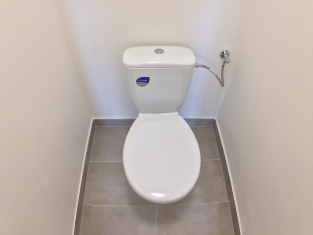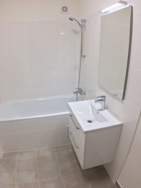 Koupelna disponuje vanou a umyvadlem s vestavěnou skříňkou a s možností připojení pračky, toaleta je odděleně.