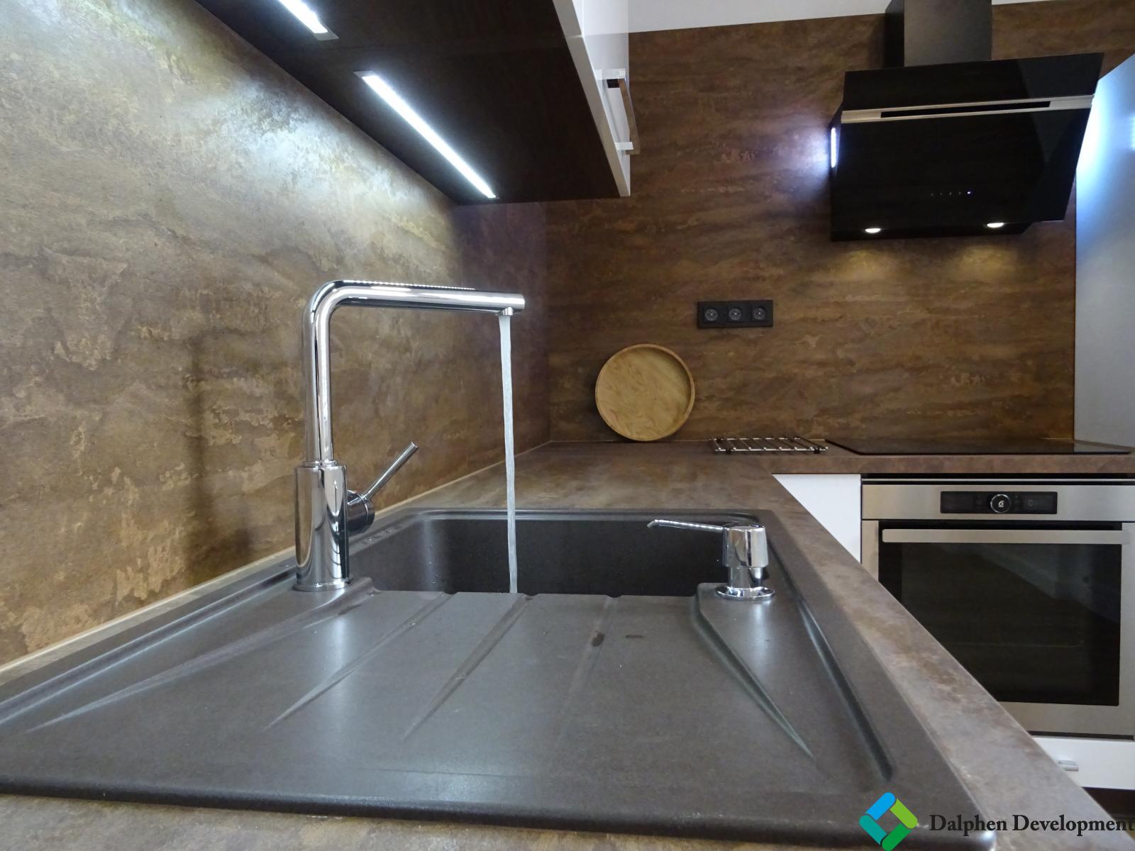 Kuchyň: Moderní linka s lakovanými dvířky, granitový dřez a baterie Blanco, vestavěné spotřebiče Whirlpool, myčka, včetně lednice s mrazákem Gorenje