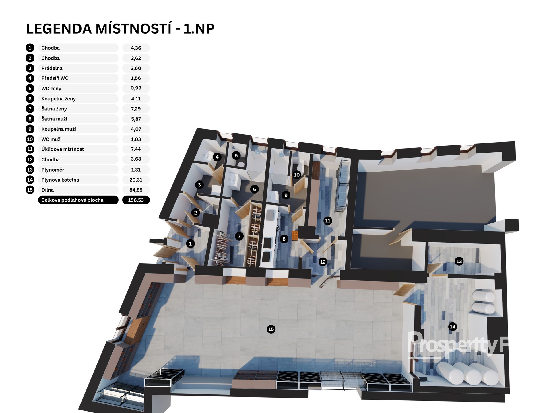 - Další prostory o výměře 156,53 m² v přízemí – vhodné pro dílnu, sklad nebo technické zázemí.
