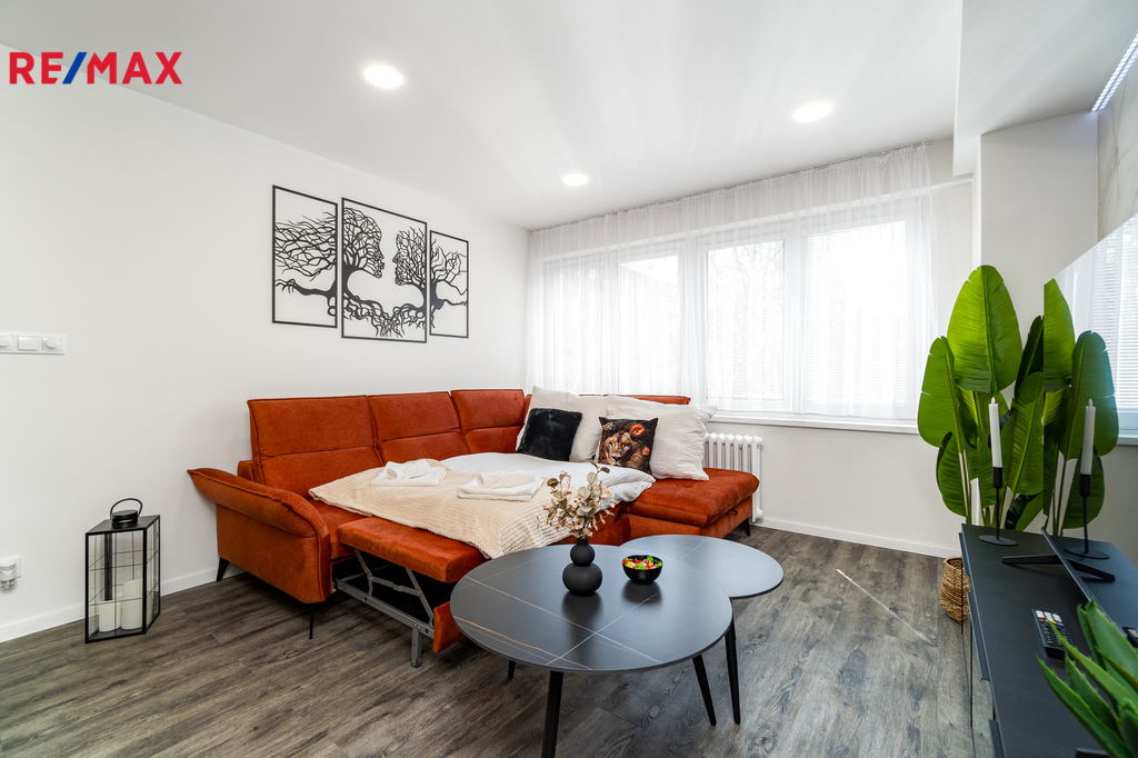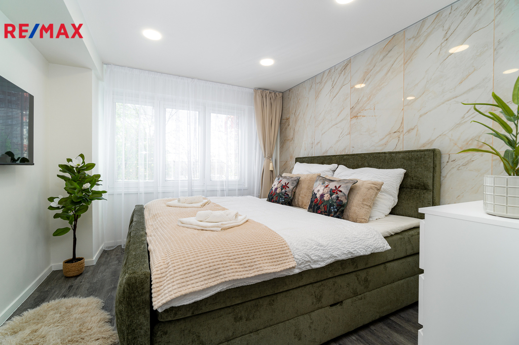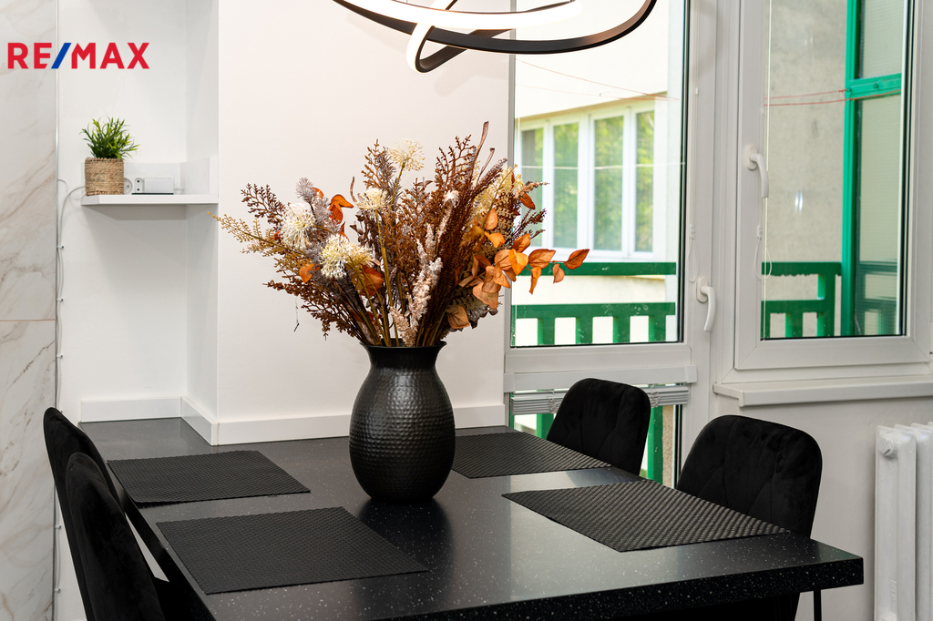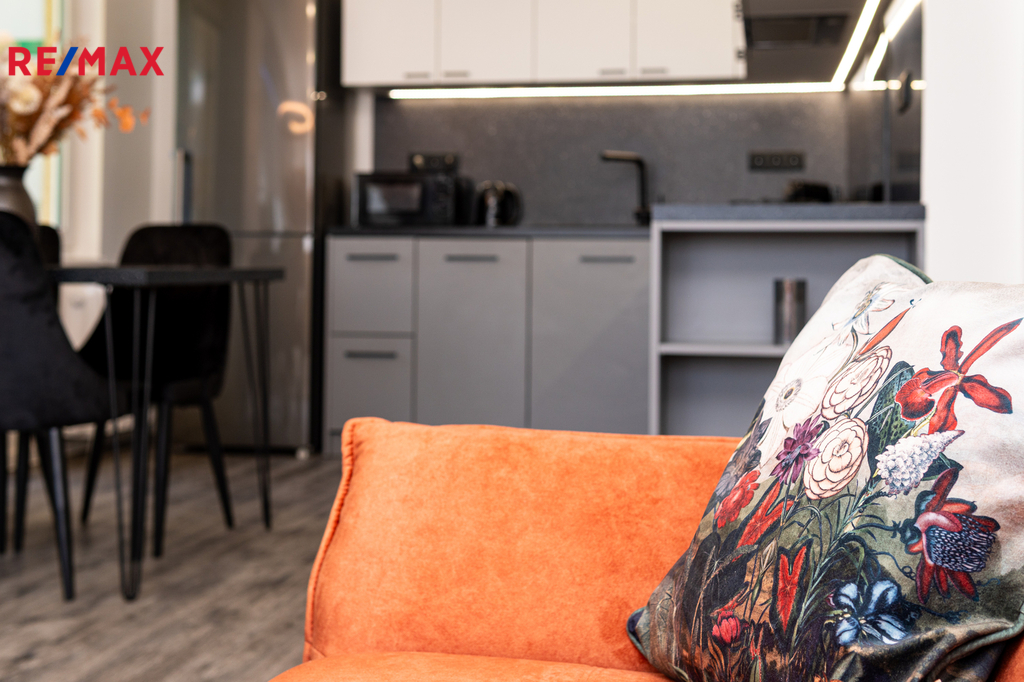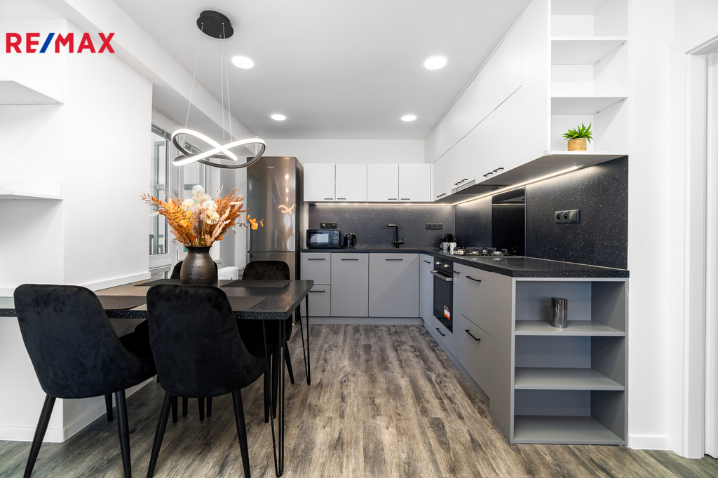 Byt prošel kompletní proměnou – vše je zcela nové: moderní kuchyňská linka s vestavnými spotřebiči, koupelna s pračkou a sušičkou, nové podlahy, dveře, elektroinstalace i sanita.