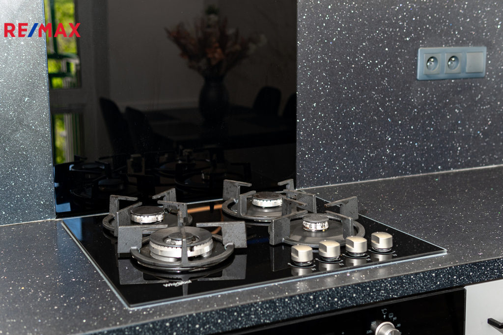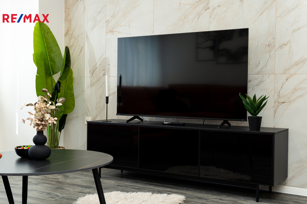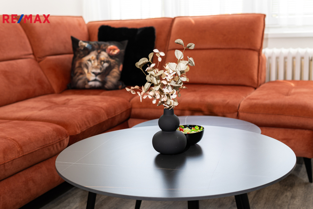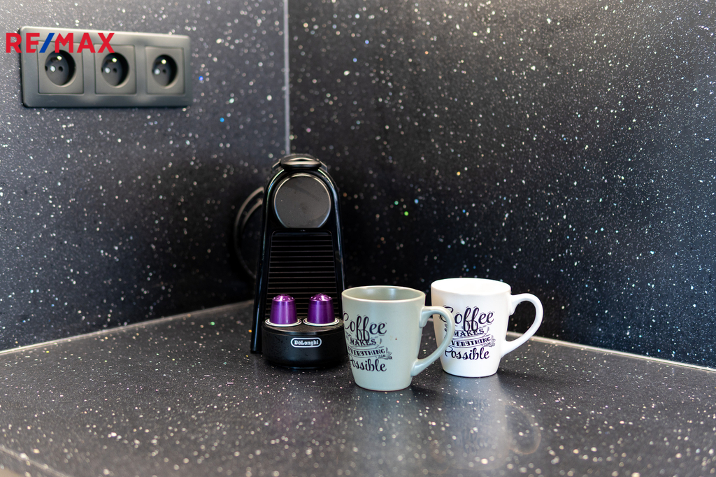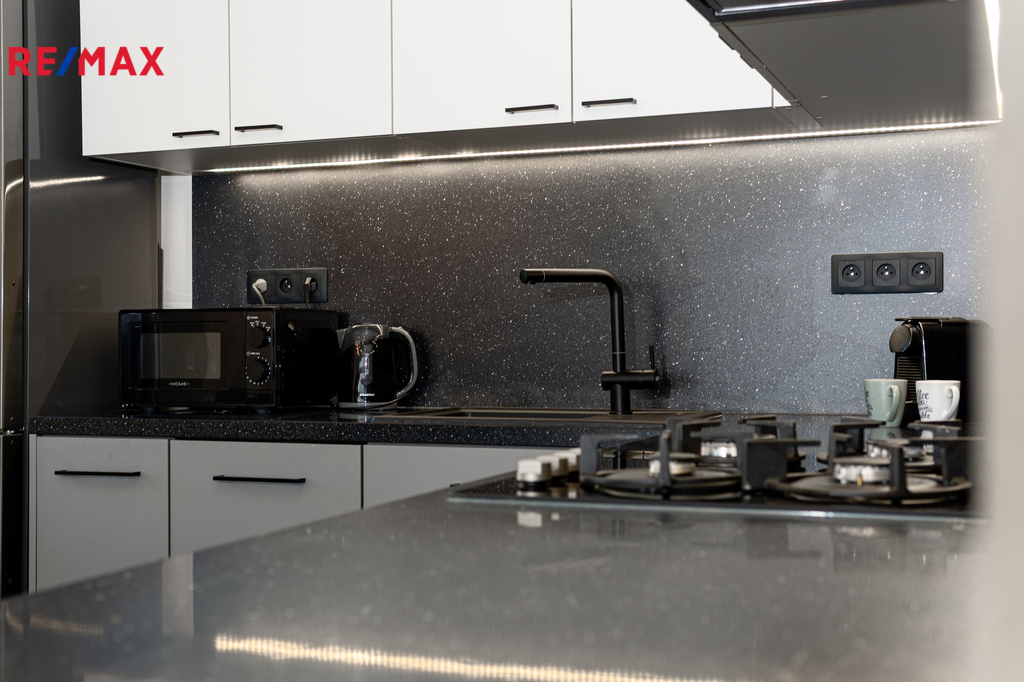 Byt prošel kompletní proměnou – vše je zcela nové: moderní kuchyňská linka s vestavnými spotřebiči, koupelna s pračkou a sušičkou, nové podlahy, dveře, elektroinstalace i sanita.
